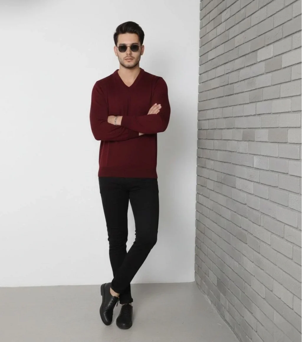 Erkek V Yaka Triko Kazak yumuşak dokulu Pamuklu ince Dokuma, uzun kollu Rahat Regular kalıp - Bordo