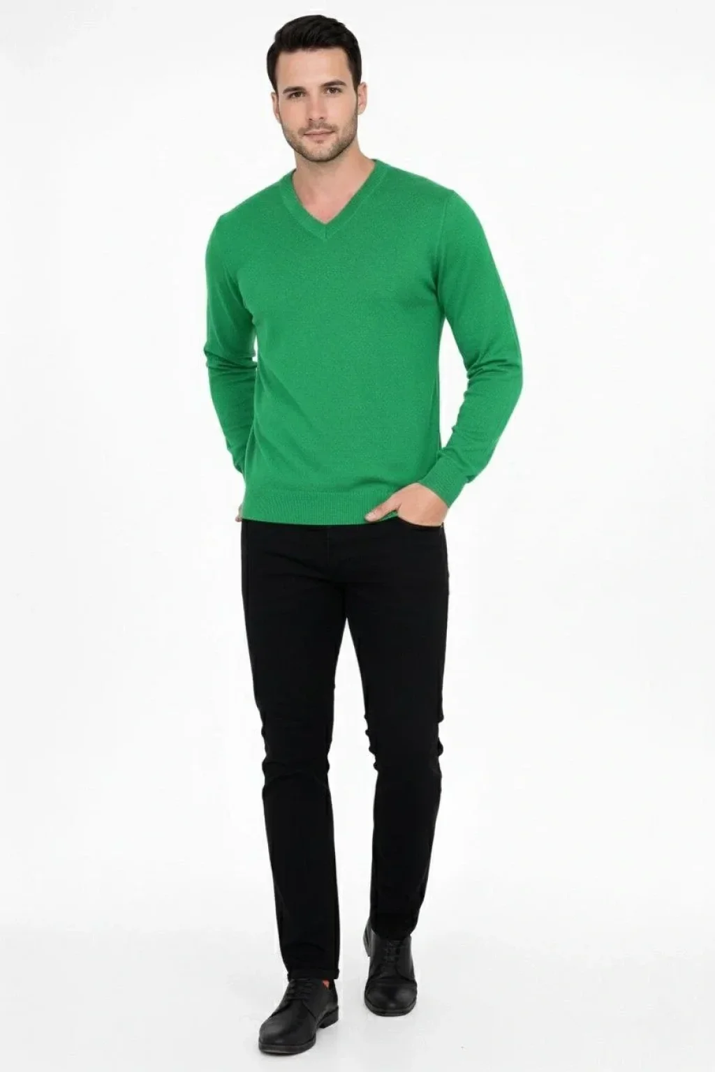Erkek V Yaka Triko Kazak yumuşak dokulu Pamuklu ince Dokuma, uzun kollu Rahat Regular kalıp - Çimen Yeşili