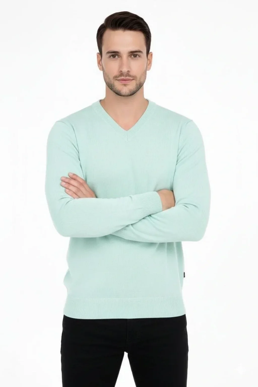 Erkek V Yaka Triko Kazak yumuşak dokulu Pamuklu ince Dokuma, uzun kollu Rahat Regular kalıp - Mint Yeşili