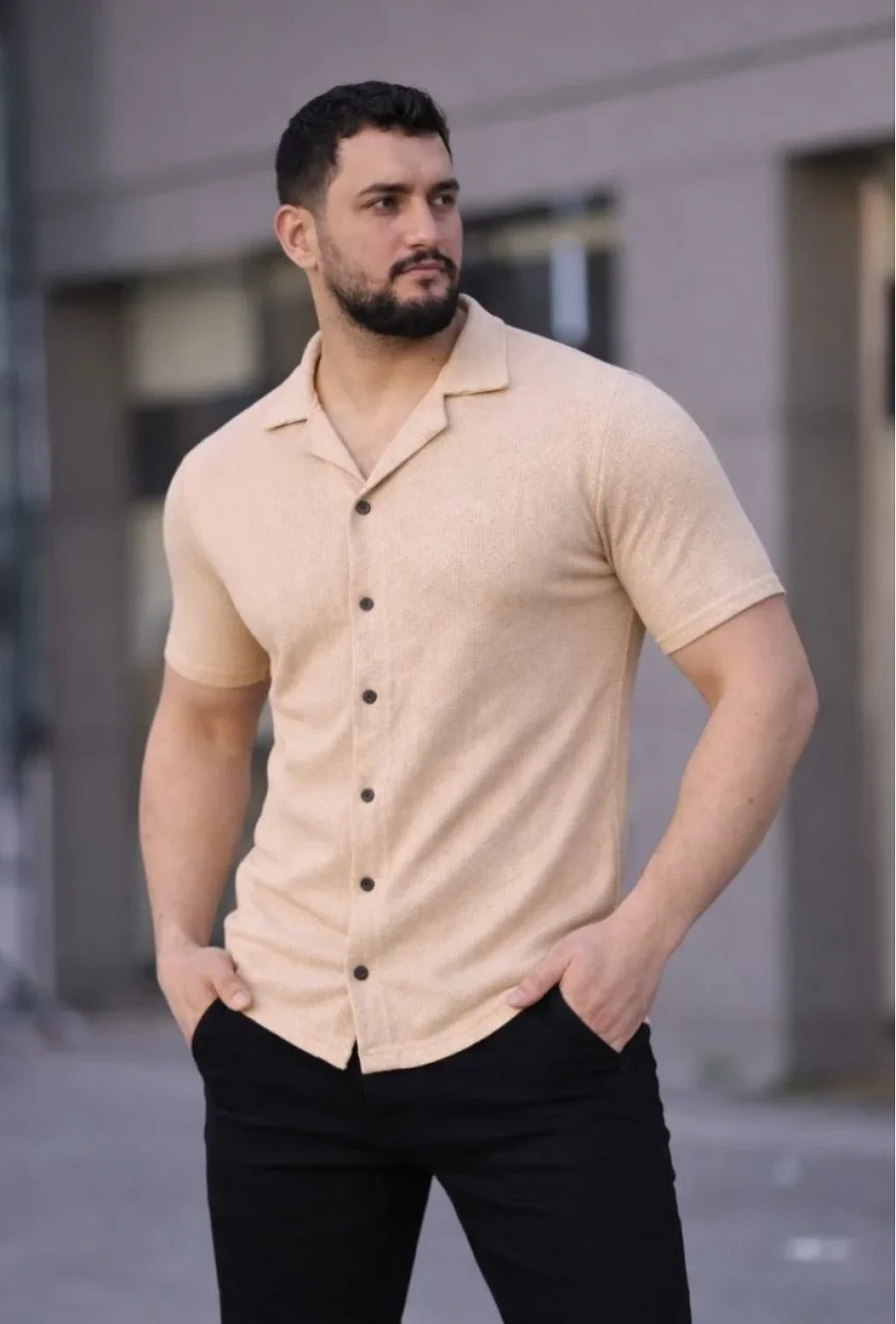 Erkek Waffle Kumaş Kısa Kollu Düğmeli Açık Yaka Regular Fit Gömlek - Bej