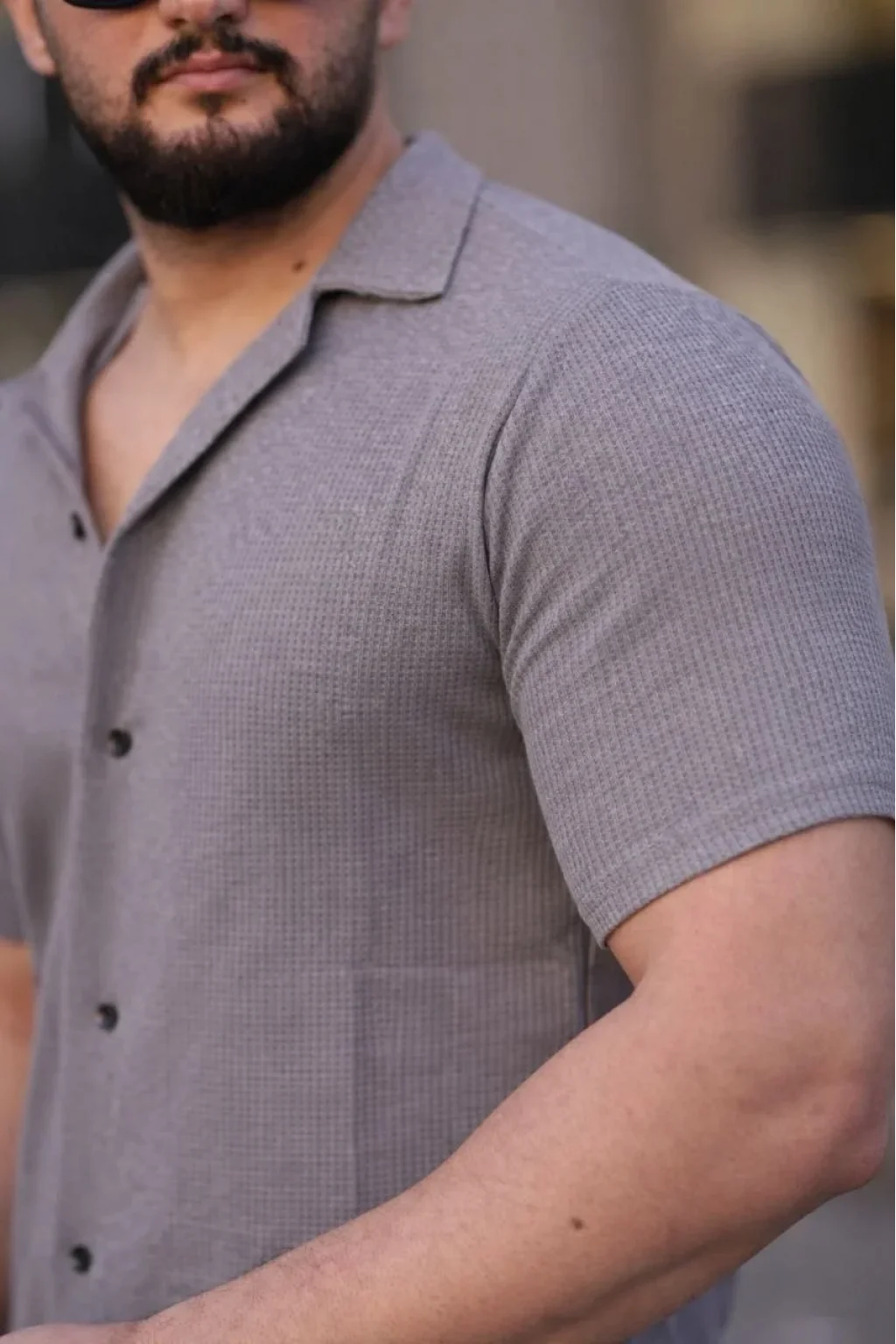Erkek Waffle Kumaş Kısa Kollu Düğmeli Açık Yaka Regular Fit Gömlek - Gri