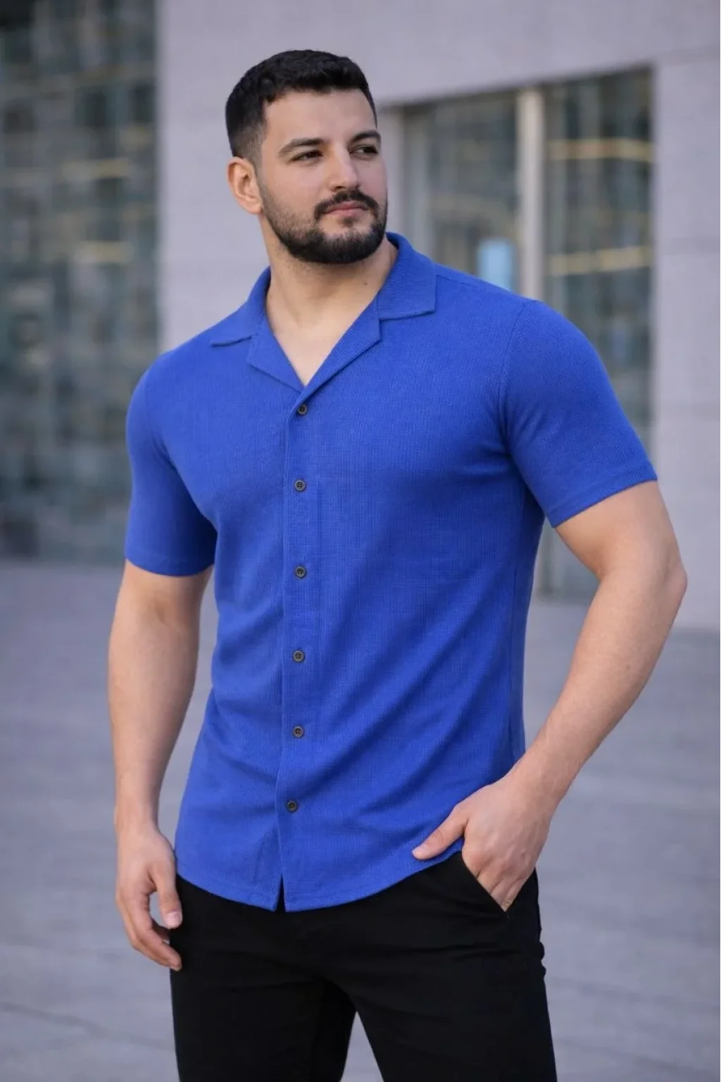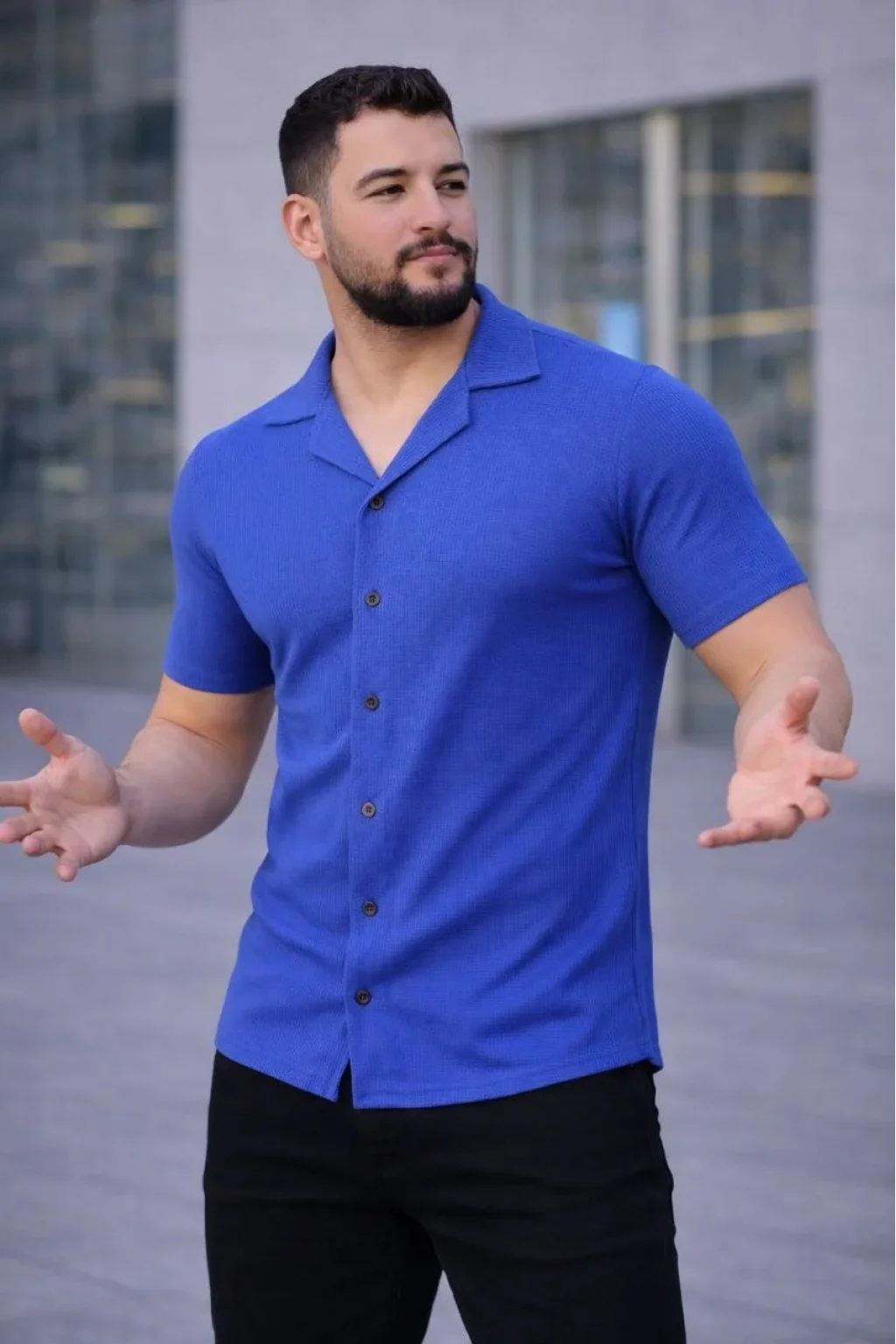 Erkek Waffle Kumaş Kısa Kollu Düğmeli Açık Yaka Regular Fit Gömlek - Saks Mavisi