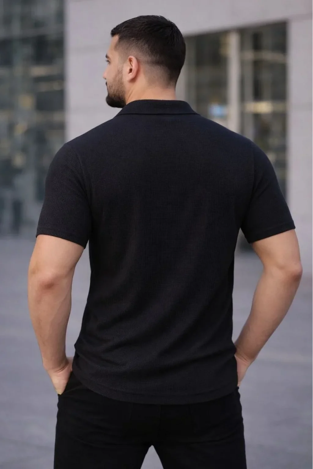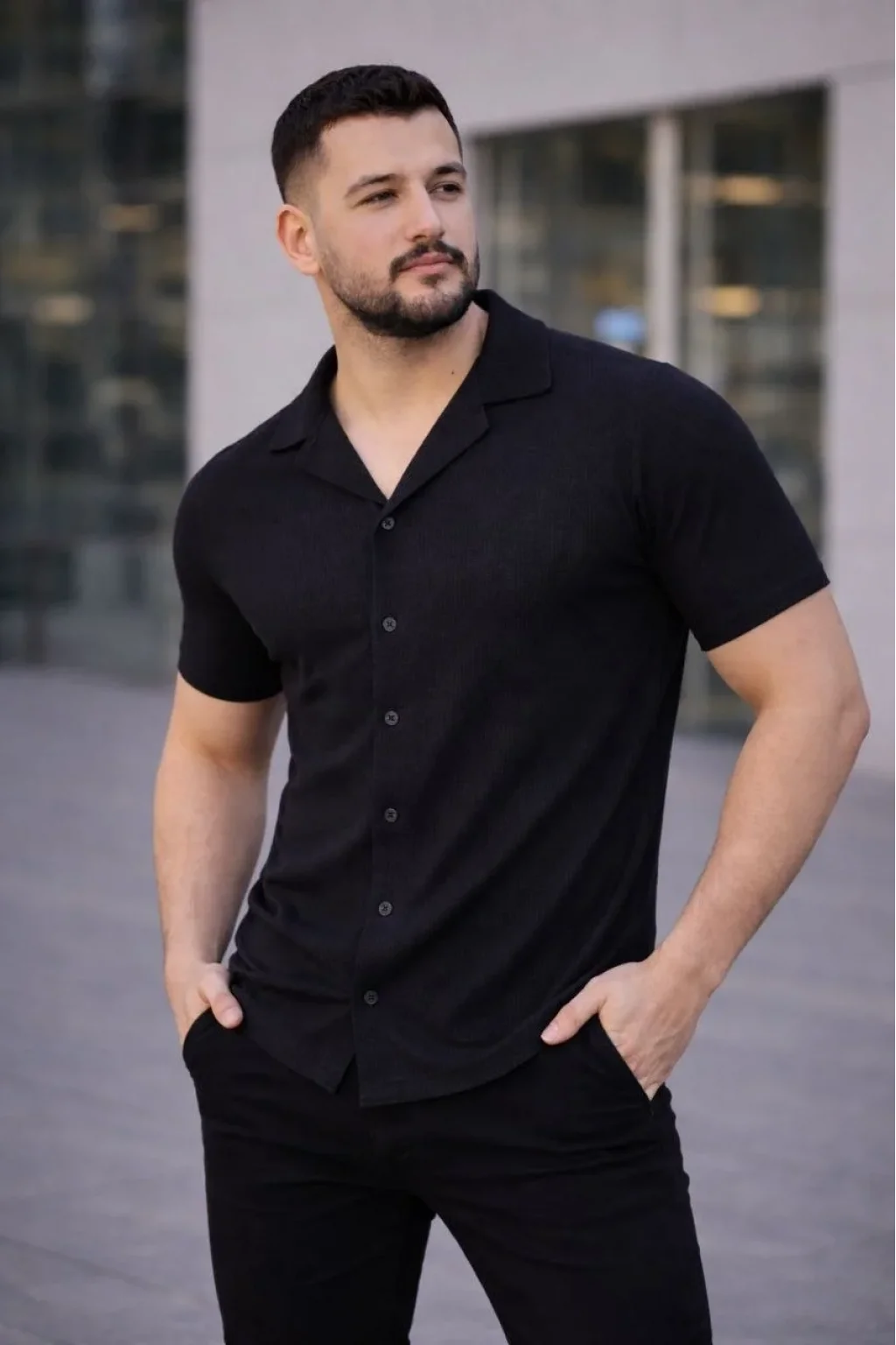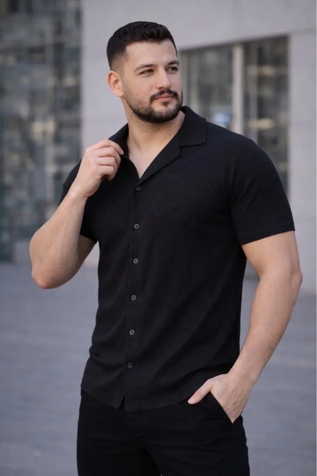 Erkek Waffle Kumaş Kısa Kollu Düğmeli Açık Yaka Regular Fit Gömlek - Siyah