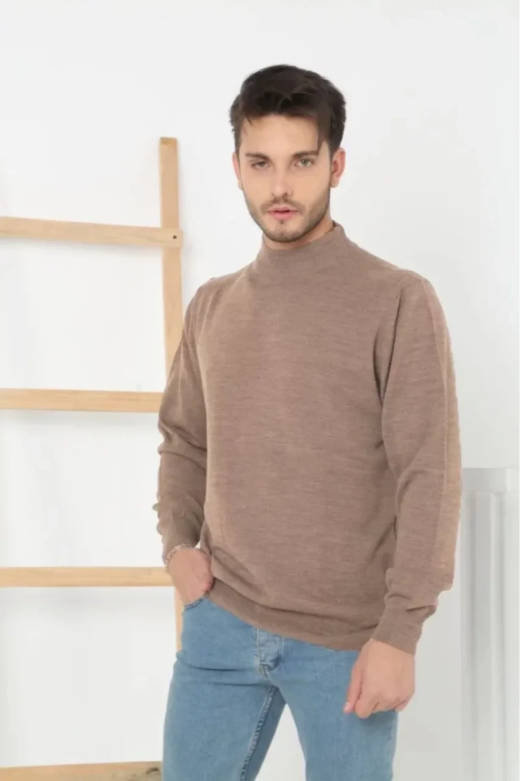 Erkek Yarım Balıkçı Yaka Triko Kazak - Vizon