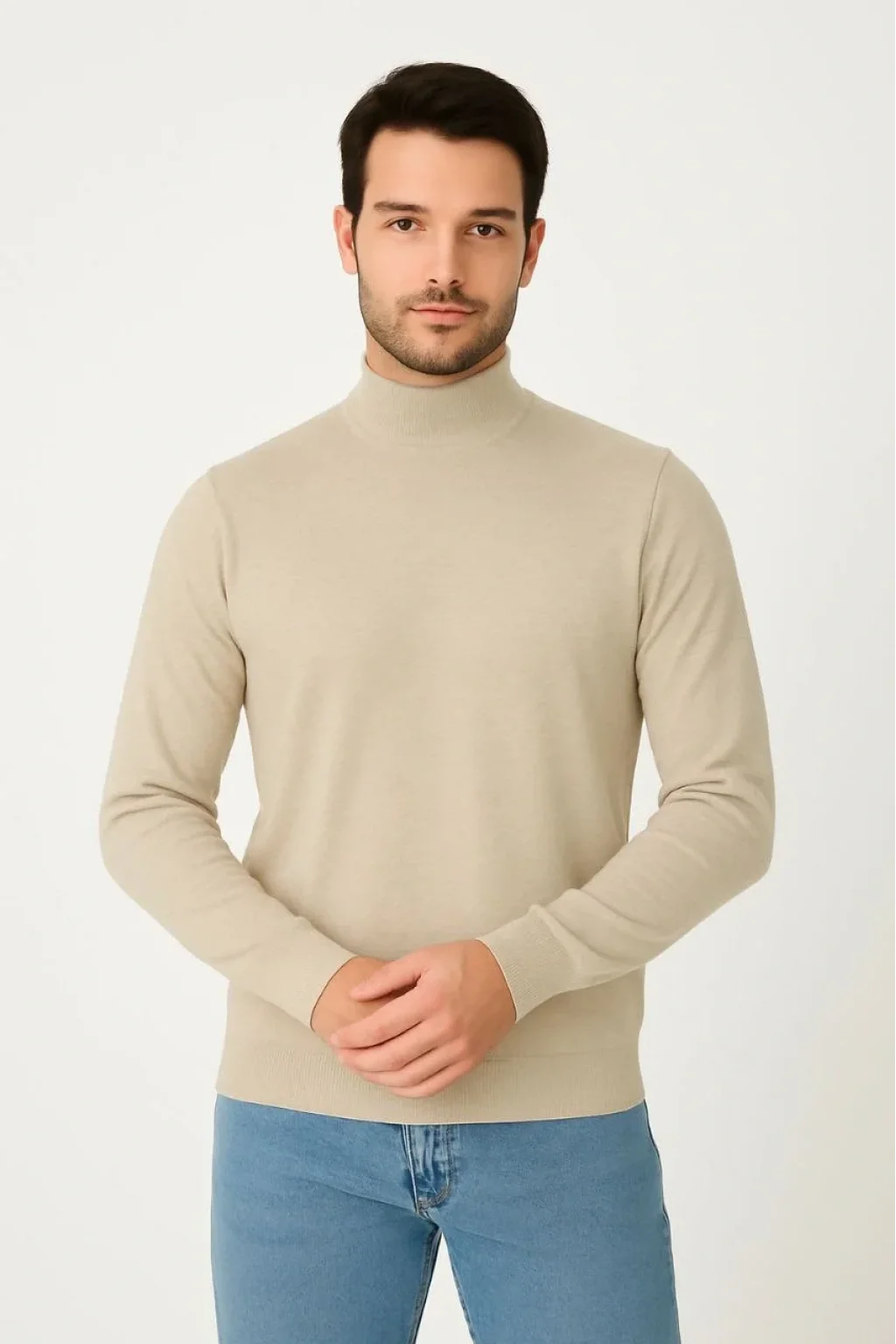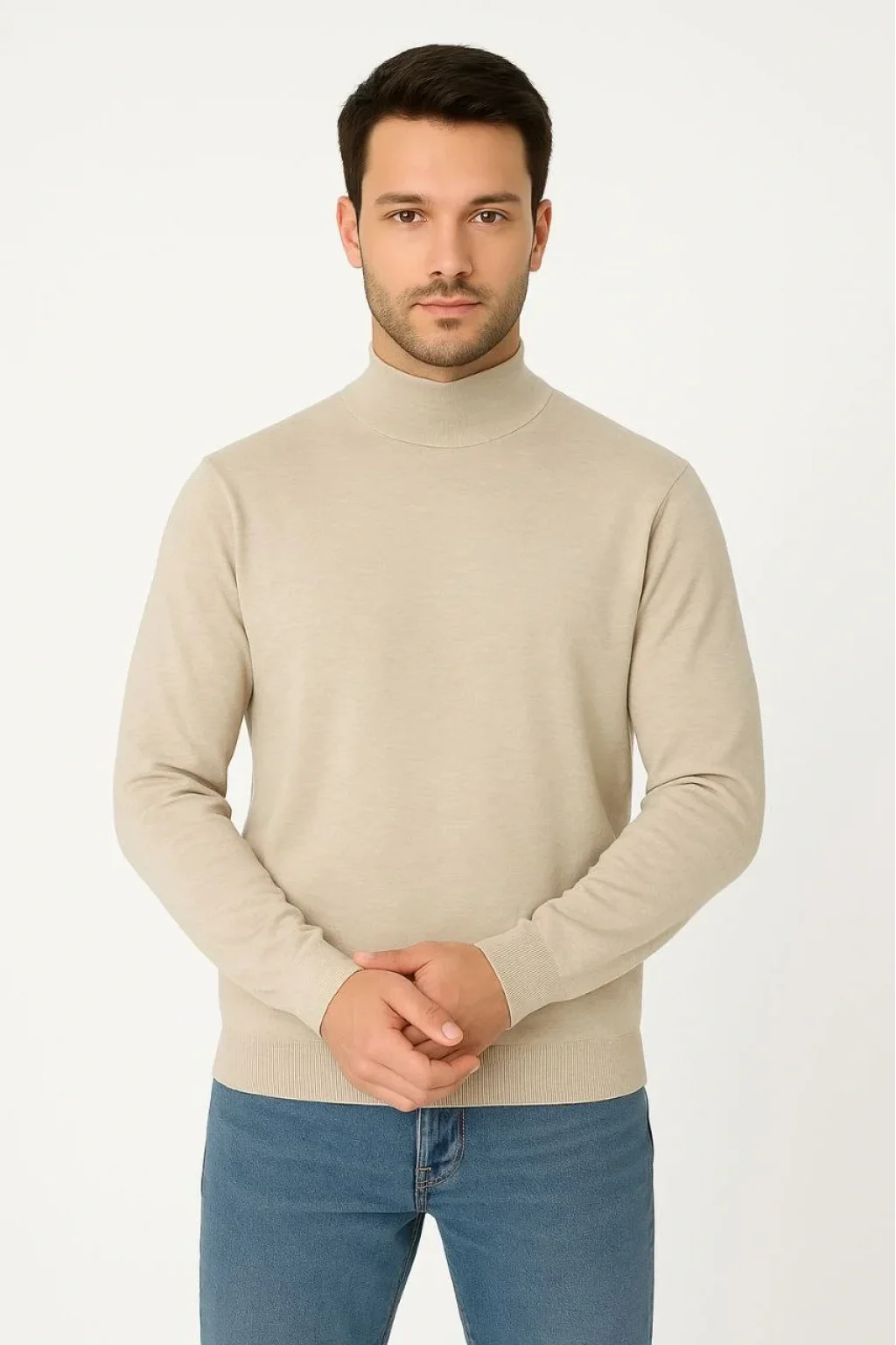 Erkek Yarım Boğaz Triko Kazak yumuşak dokulu Pamuklu ince Dokuma, uzun kollu Rahat Regular kalıp - Bej