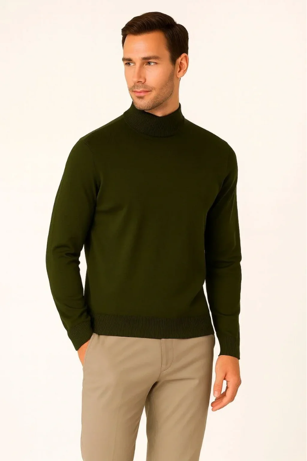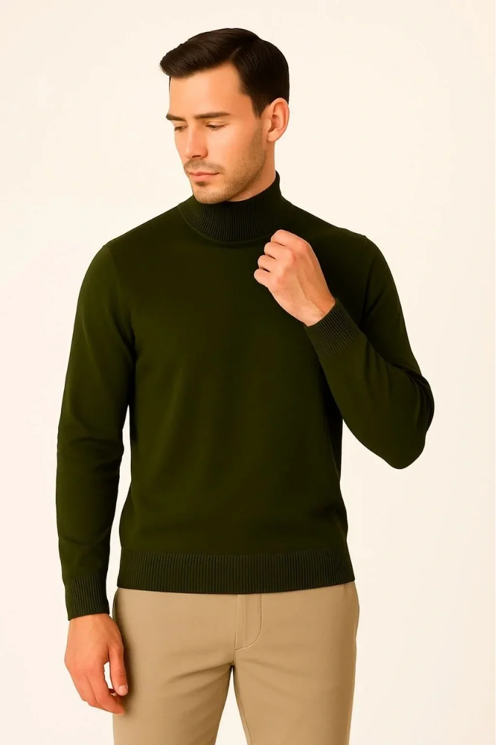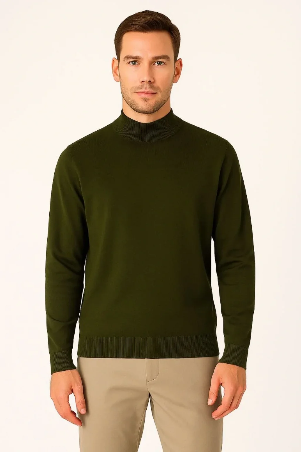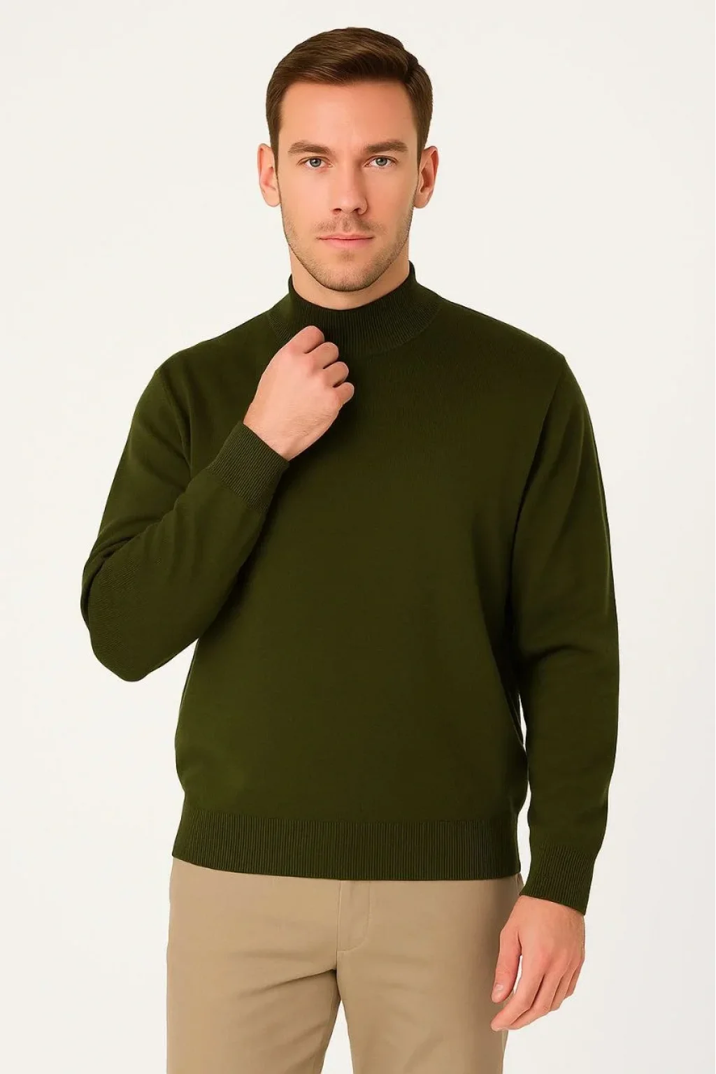 Erkek Yarım Boğaz Triko Kazak yumuşak dokulu Pamuklu ince Dokuma, uzun kollu Rahat Regular kalıp - Haki