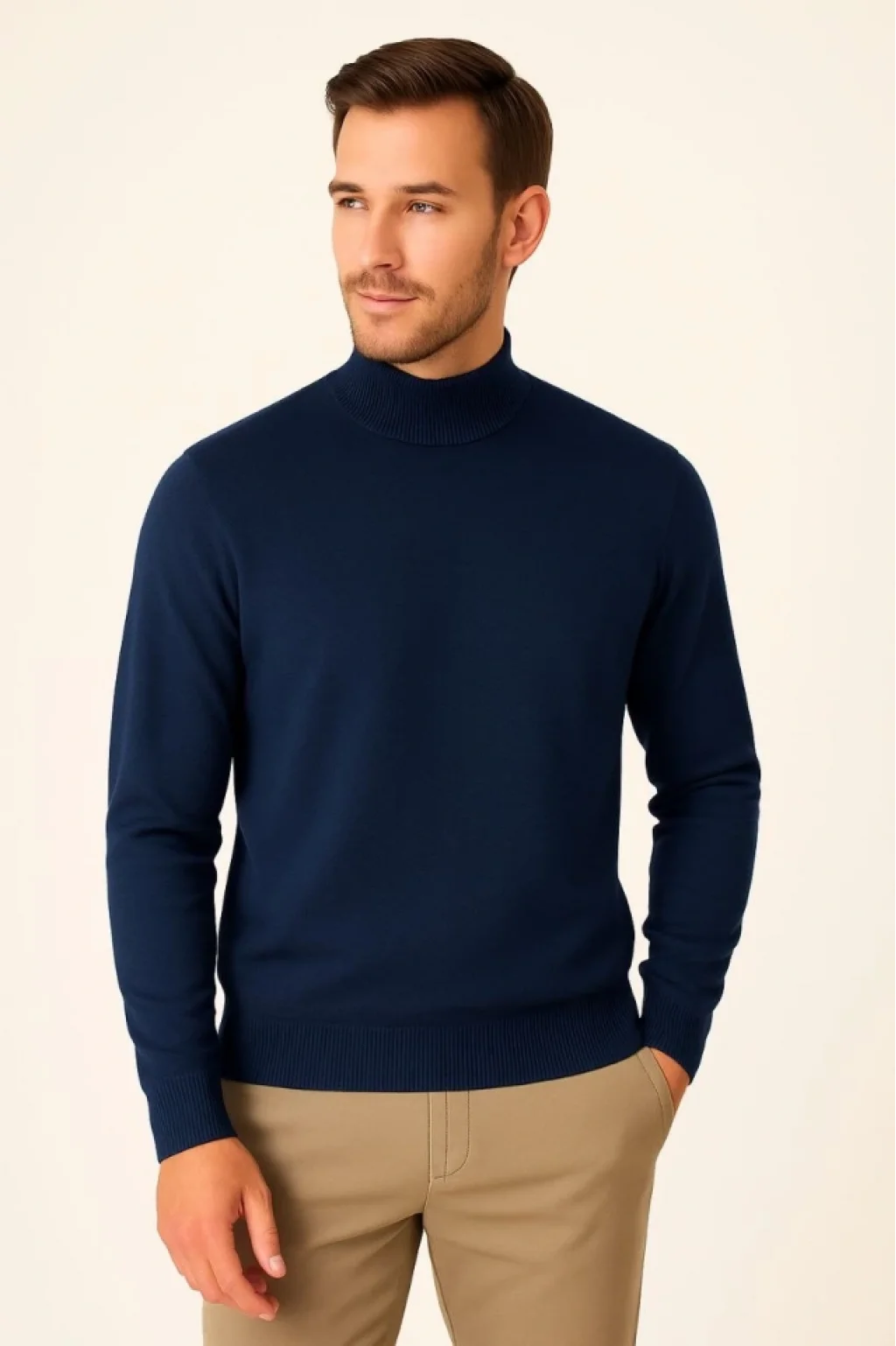 Erkek Yarım Boğaz Triko Kazak Yumuşak Dokulu Pamuklu Ince Dokuma, Uzun Kollu Rahat Regular Kalıp - Lacivert