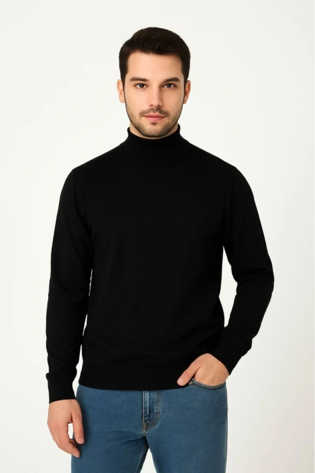 Erkek Yarım Boğaz Triko Kazak Yumuşak Dokulu Pamuklu Ince Dokuma, Uzun Kollu Rahat Regular Kalıp - Siyah