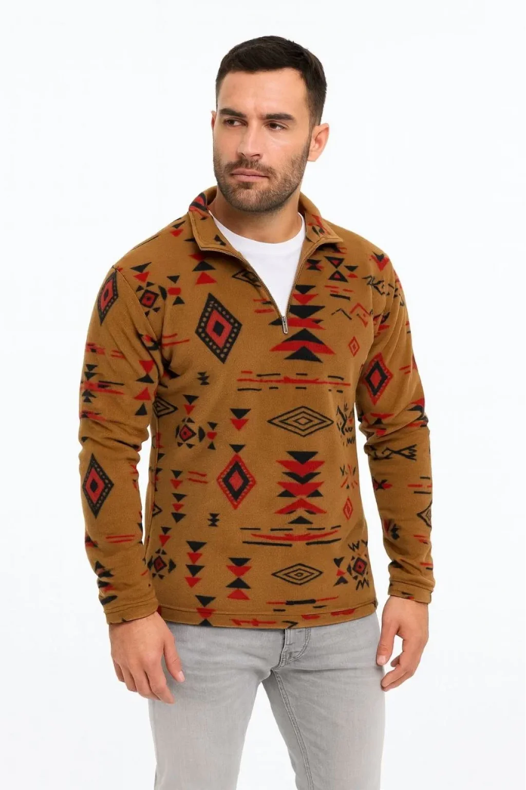 Erkek Yarım Fermuarlı Desenli Polar Sweat Tribal Etnik Desen Yakalı, Uzun Kollu, Oversize Rahat Kalıp, - Kahverengi