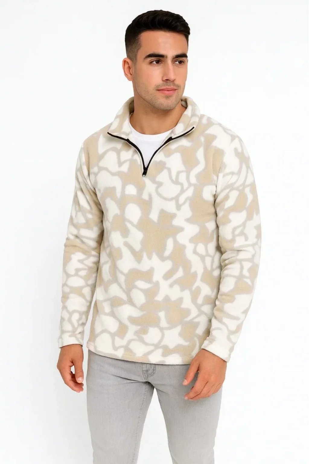 Erkek Yarım Fermuarlı Desenli Polar Sweat Yakalı, Uzun Kollu, Oversize Rahat Kalıp - Bej
