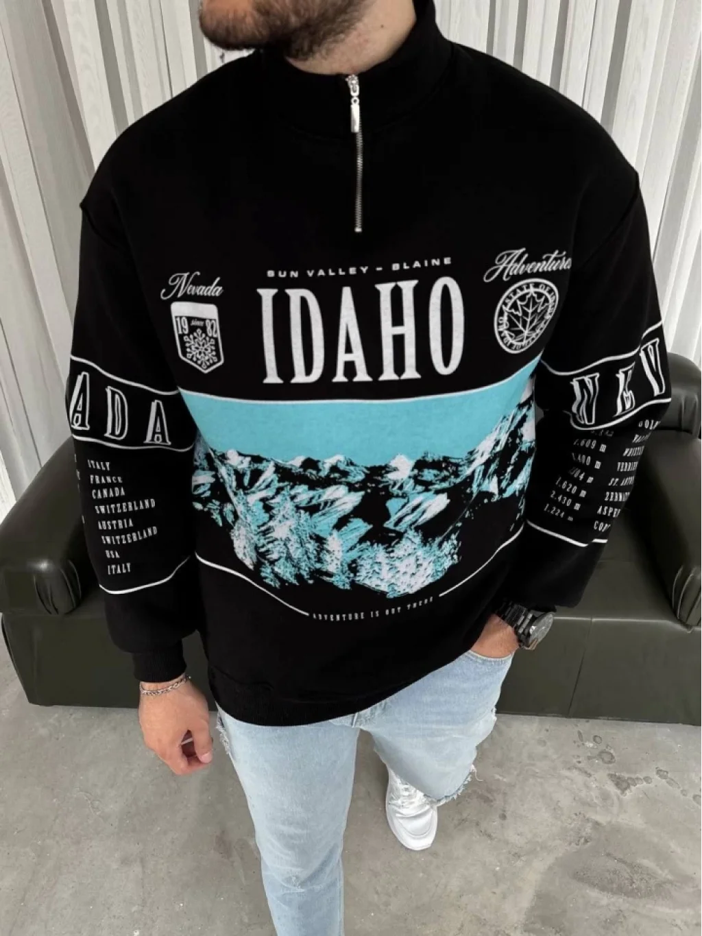 Erkek Yarım Fermuarlı Oversize Baskılı SweatShirt - Siyah