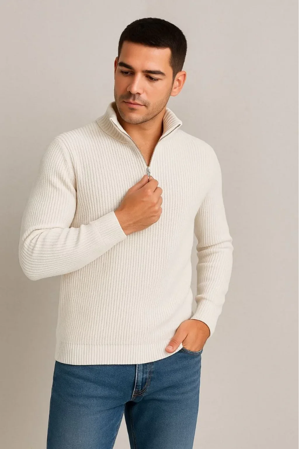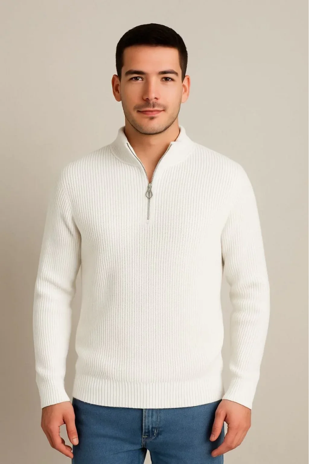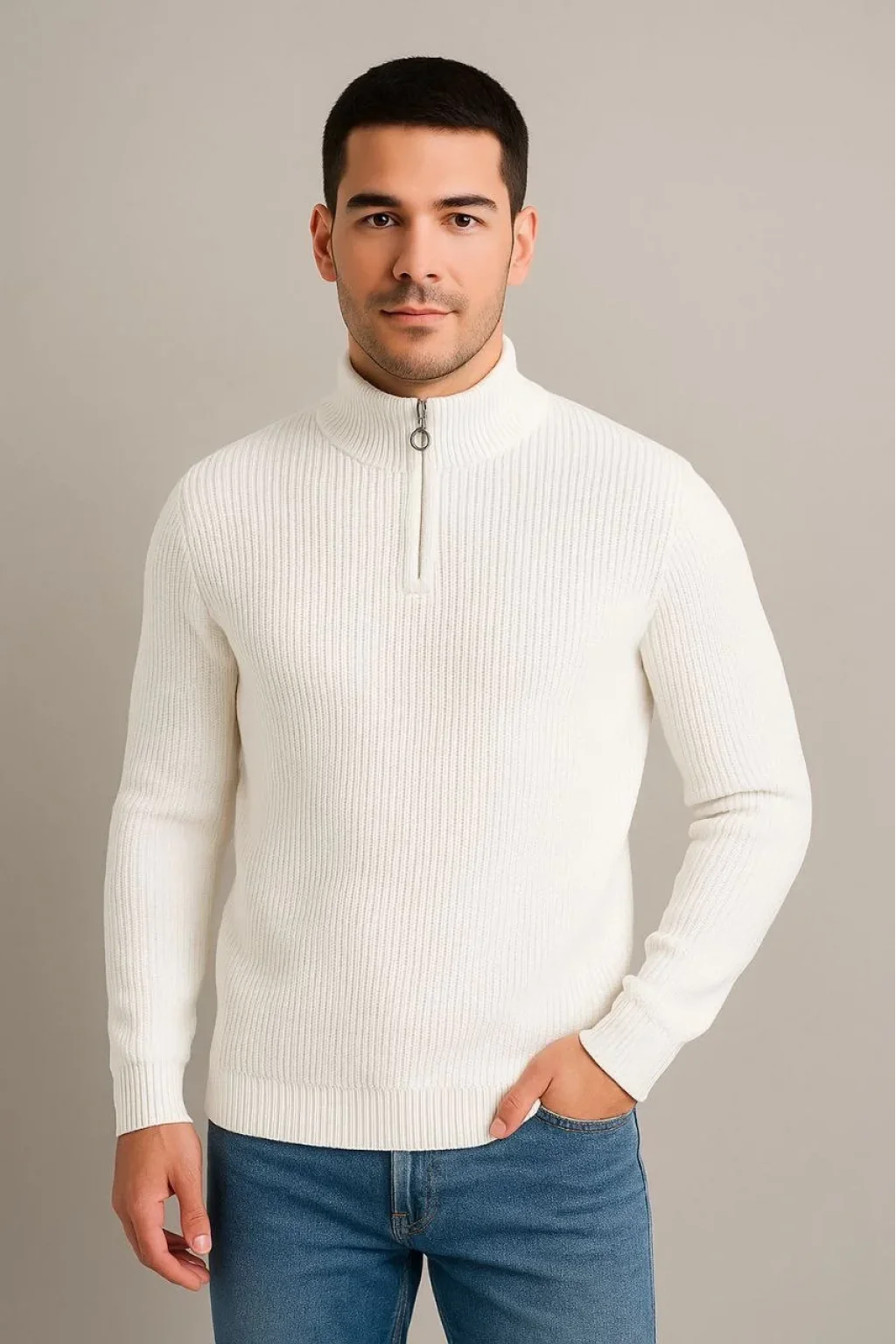 Erkek Yarım Fermuarlı Triko Kazak – Selanik Örgü, Dik Yaka, Pamuklu Dokuma, Regular Fit Uzun Kollu Kışlık Model - Beyaz