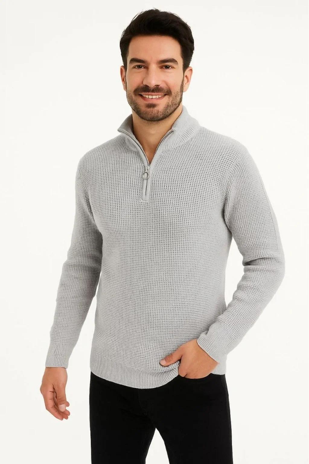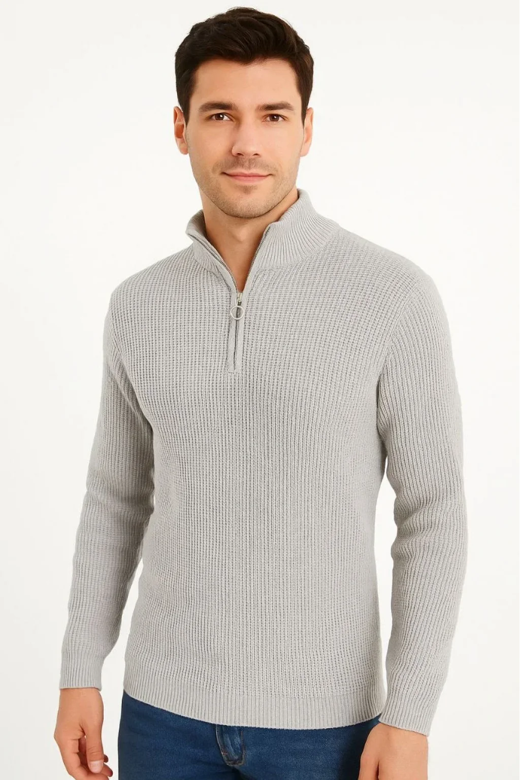 Erkek Yarım Fermuarlı Triko Kazak – Selanik Örgü, Dik Yaka, Pamuklu Dokuma, Regular Fit Uzun Kollu Kışlık Model - Gri