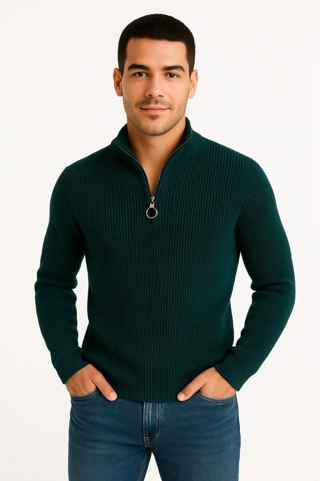 Erkek Yarım Fermuarlı Triko Kazak – Selanik Örgü, Dik Yaka, Pamuklu Dokuma, Regular Fit Uzun Kollu Kışlık Model - Haki