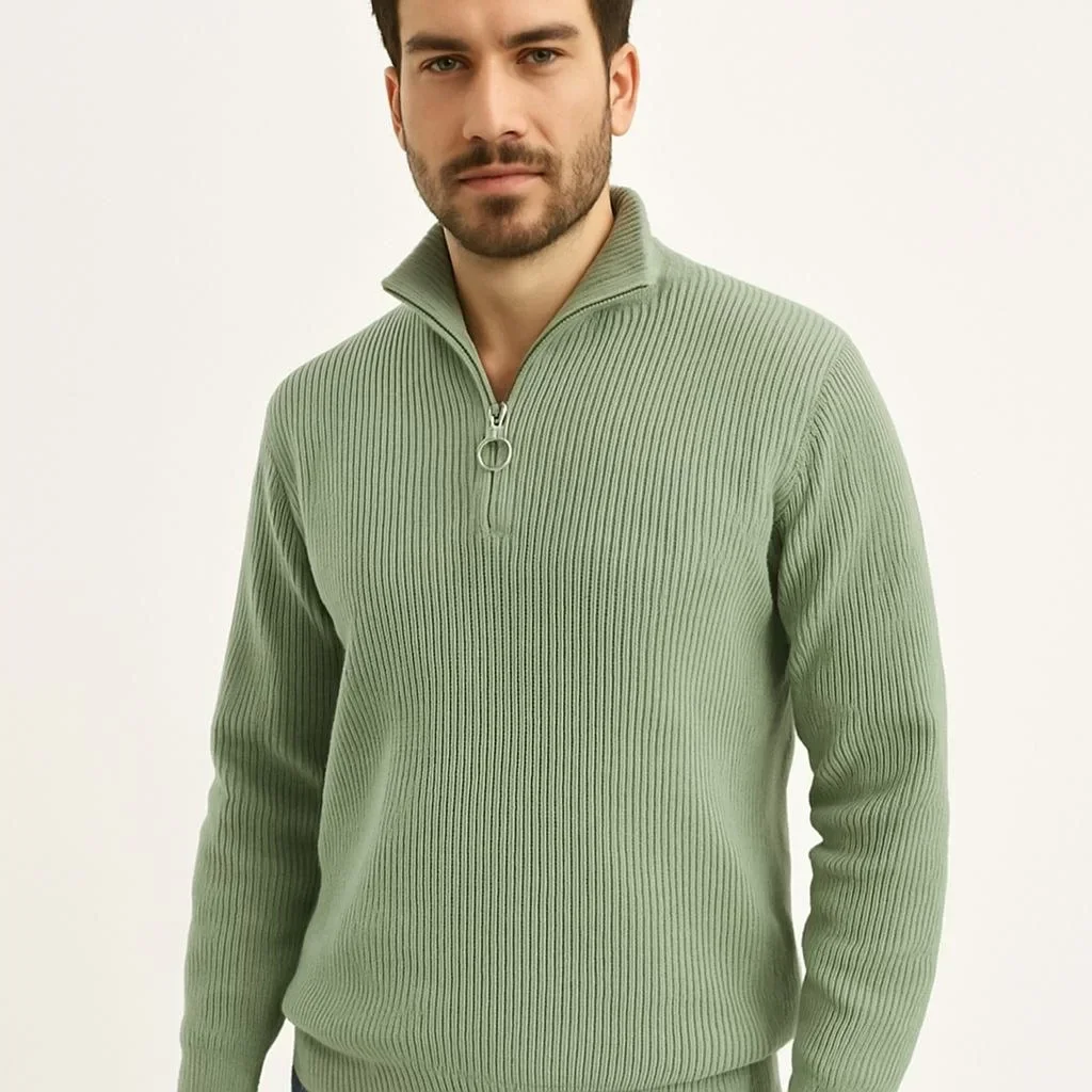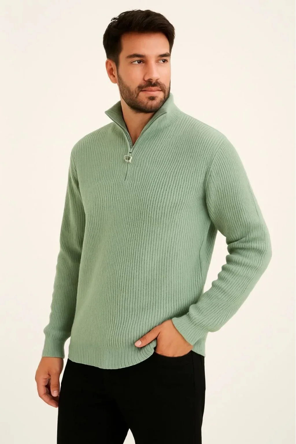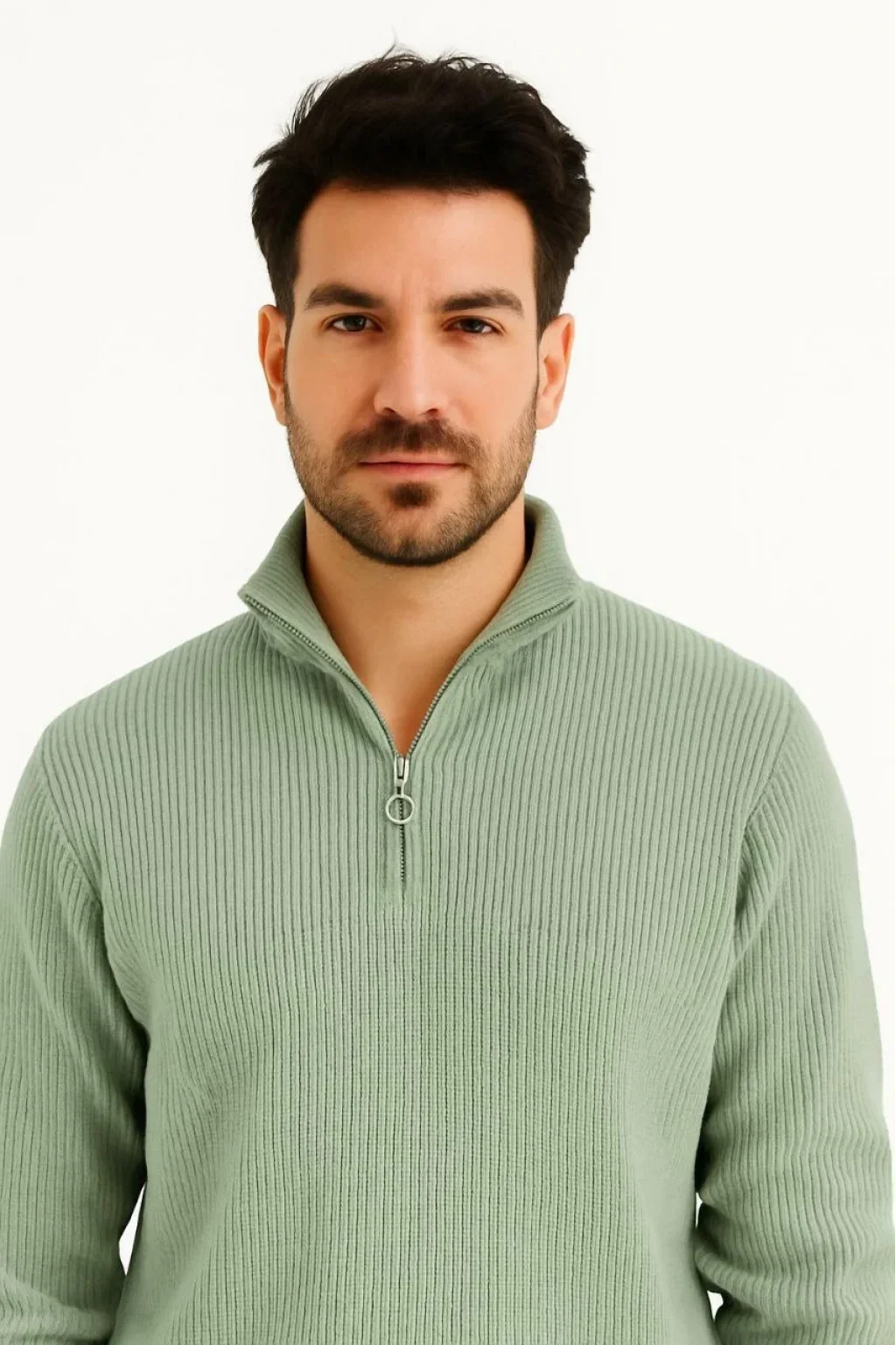Erkek Yarım Fermuarlı Triko Kazak – Selanik Örgü, Dik Yaka, Pamuklu Dokuma, Regular Fit Uzun Kollu Kışlık Model - Mint Yeşili