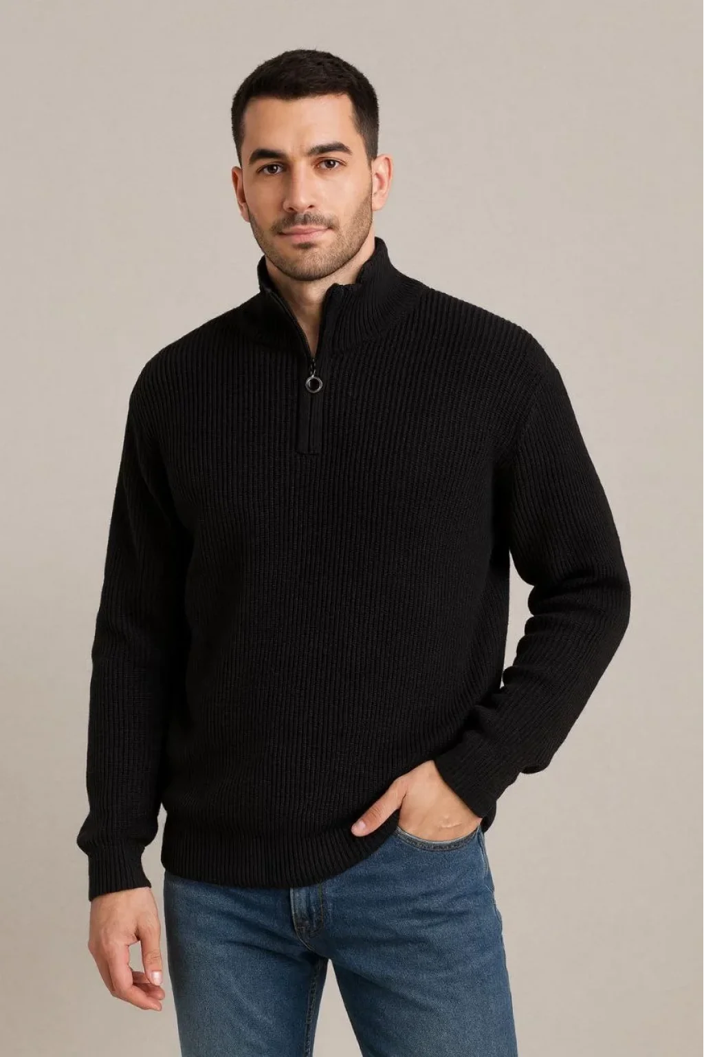 Erkek Yarım Fermuarlı Triko Kazak – Selanik Örgü, Dik Yaka, Pamuklu Dokuma, Regular Fit Uzun Kollu Kışlık Model - Siyah