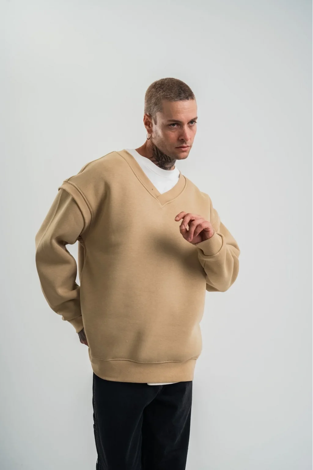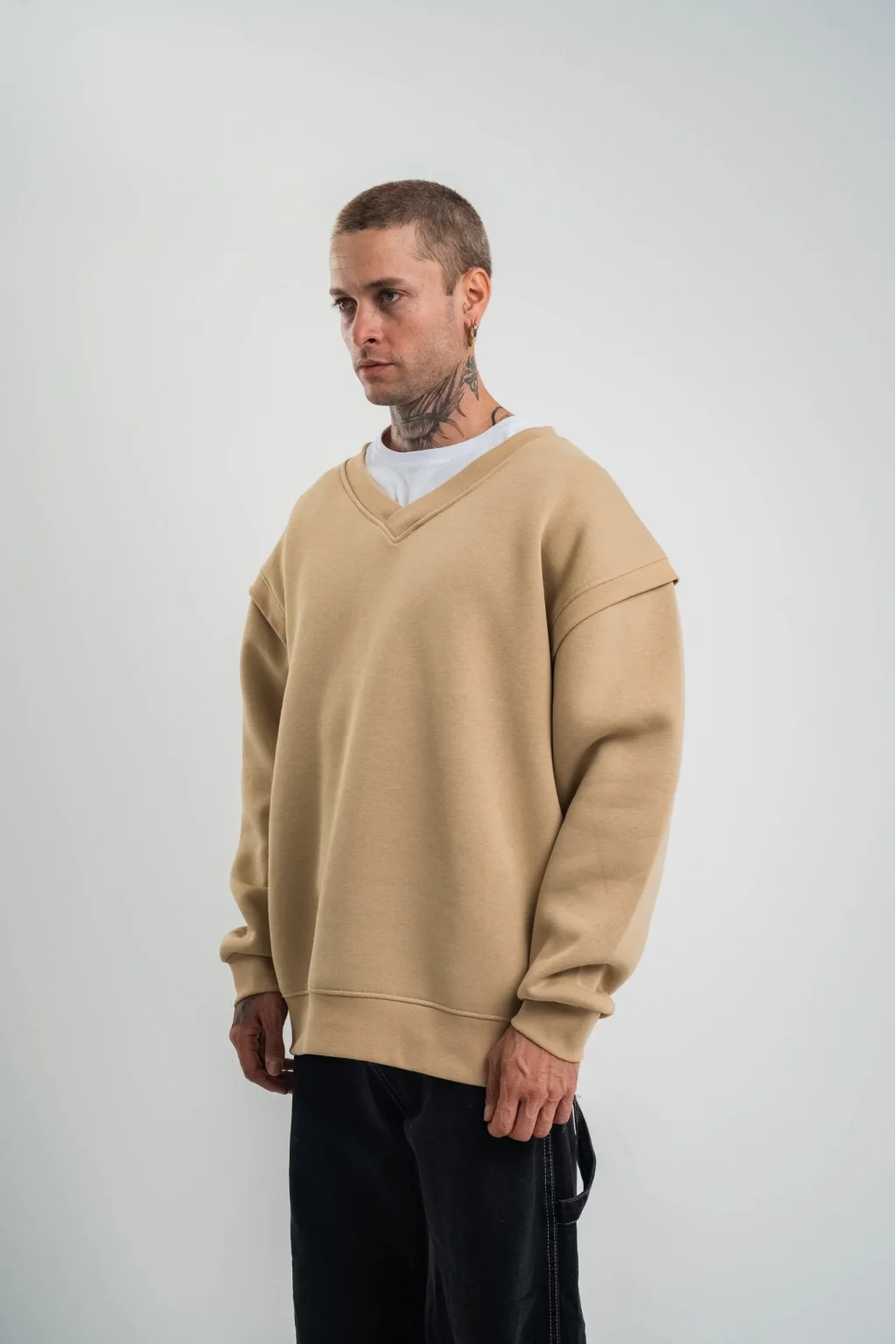 Geniş V yaka Kol Ribana Detaylı SweatShirt - Bej