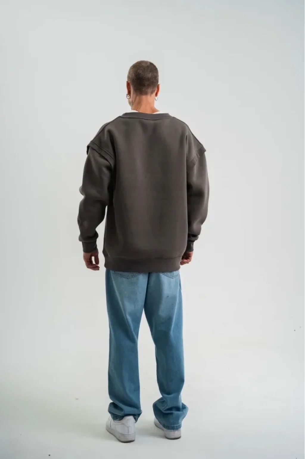 Geniş V Yaka Kol Ribana Detaylı SweatShirt - Füme