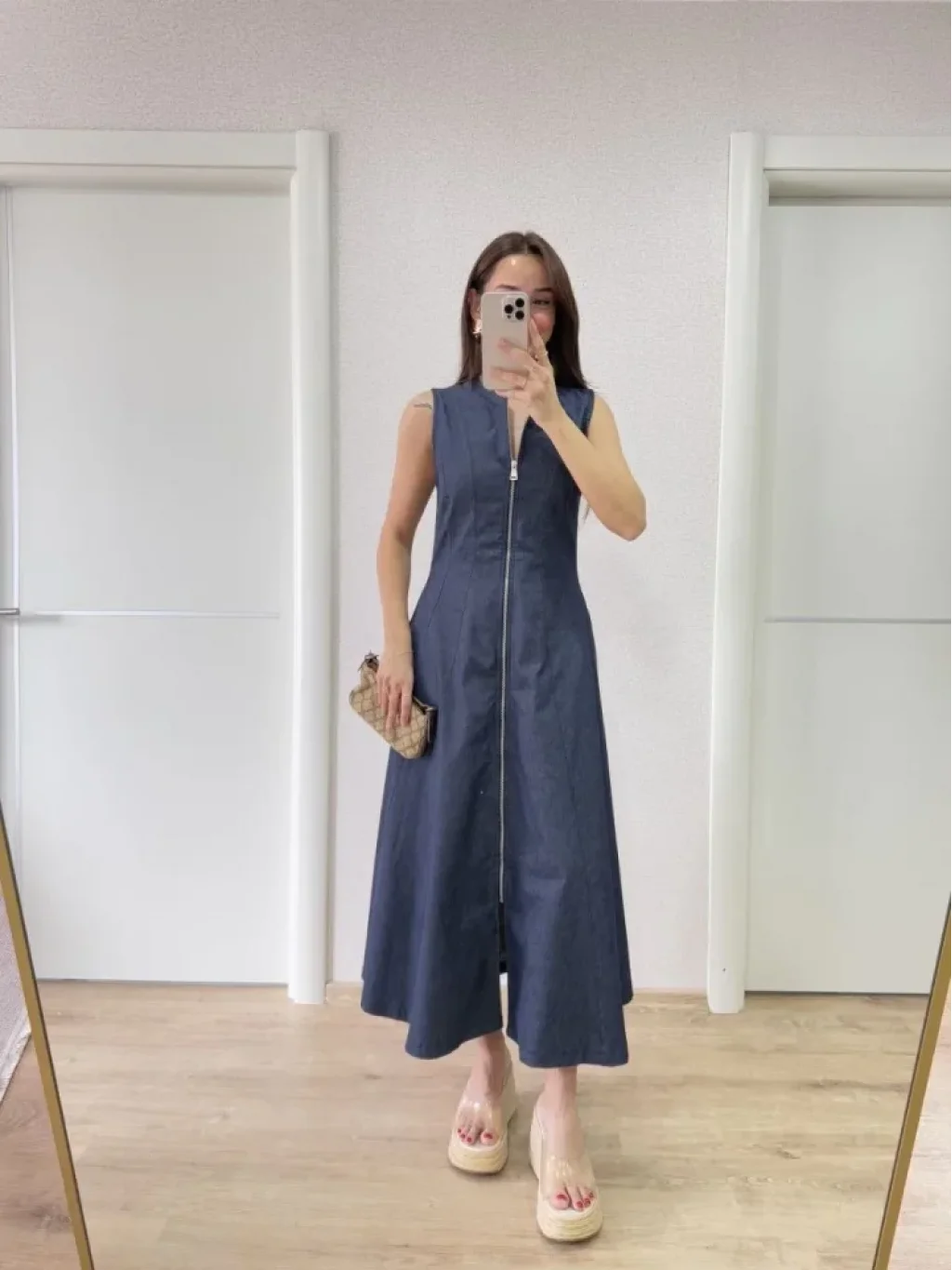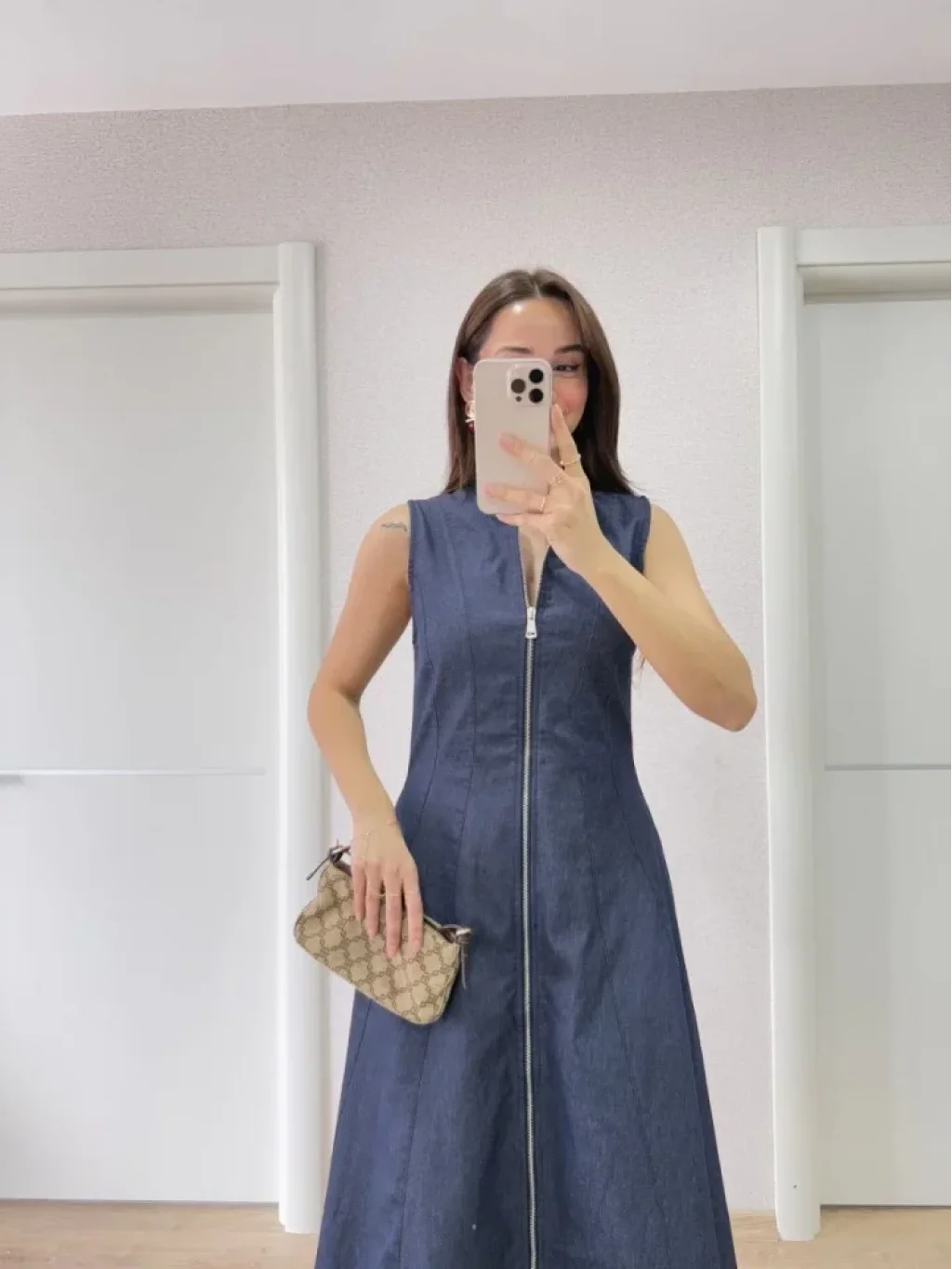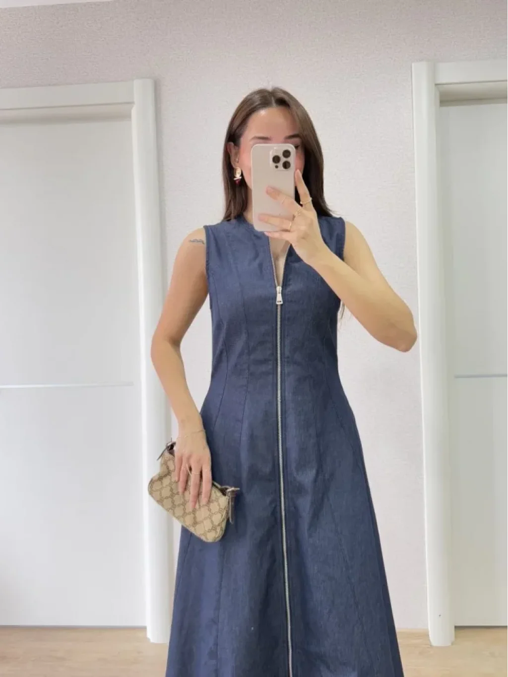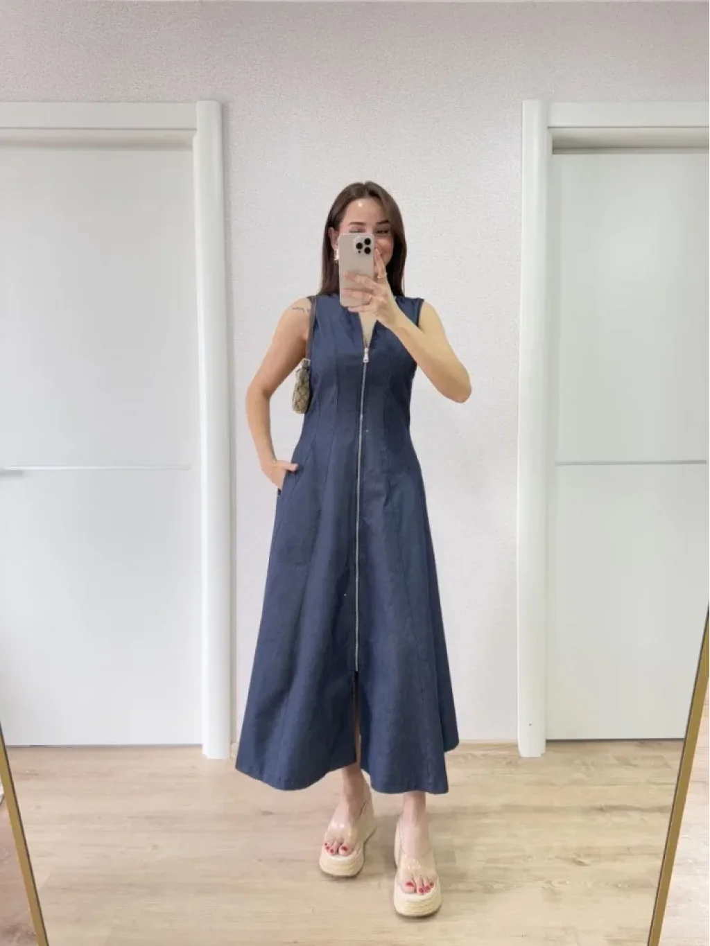 Jeans Kot Önü Tam Fermuarlı Uzun Elbise - Mavi