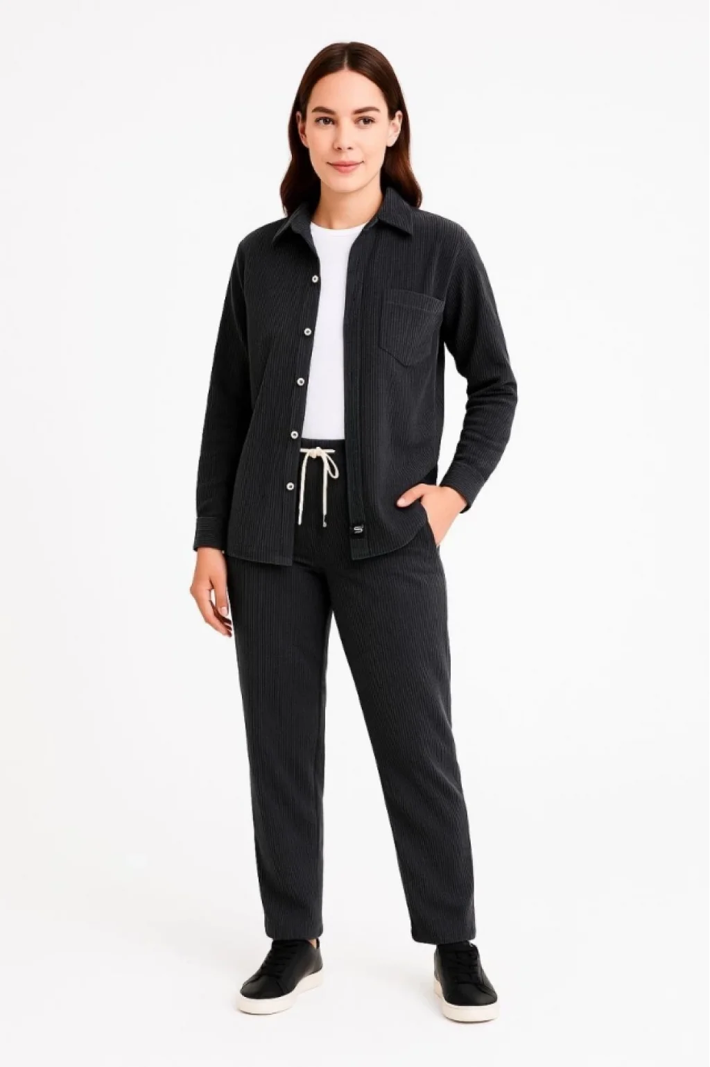 Kadife Oversize Takım – Gömlek Ve Pantolon İkili Set Füme Corduroy Şıklığı, Rahat Ve Zarif Duruş Yumuşak Dokulu Kadife Kumaş, Düğmeli Gömlek Üst Ve Lastikli Pantolon Alt Parça Ile Gün Boyu Konfor- Siyah