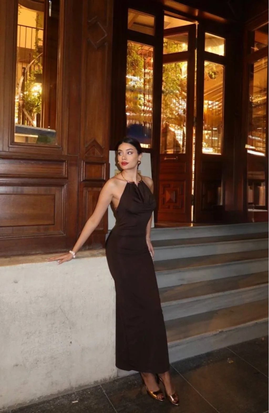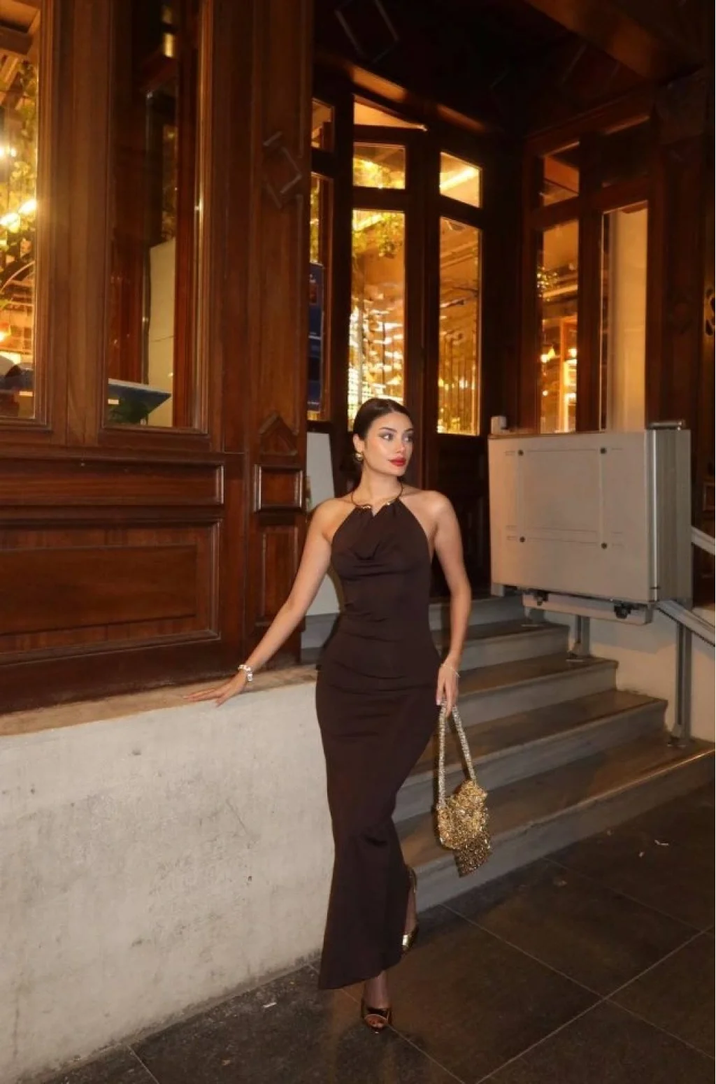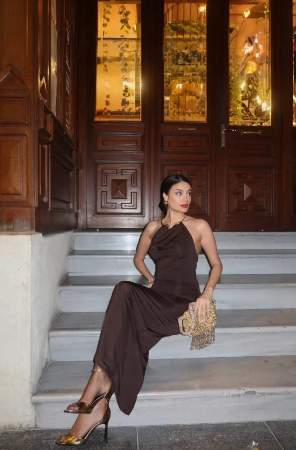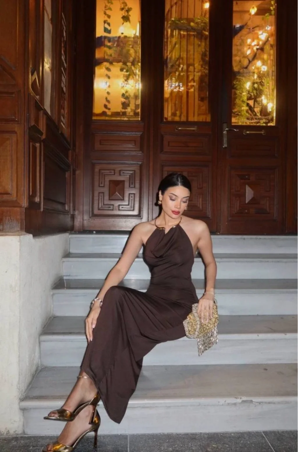 Kadın Aksesuarlı Halter Yaka Sırt Dekolte Detay Maxi Boy Elbise