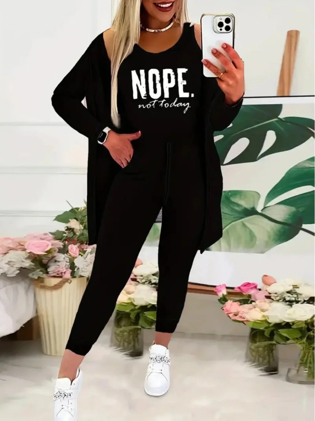 Kadın Askılı Yuvarlak Yaka Yazılı Viskon Iki Iplik Bluz Ceket Ve Pantolon 3lü Takım