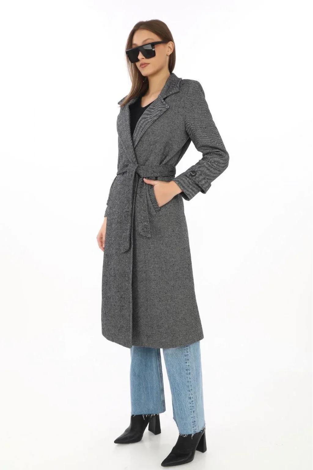 Kadın Balık Sırtı Kaşe Kaban – Uzun Boy Kruvaze Yaka Kuşaklı Astarlı Kışlık Tesettür Kaban, Yünlü Dokuma Kaşmir Kumaş, Cepli Rahat Oversize Kalıp Şık Modern Kaban Mont Modeli (Günlük ve Özel Gün Kombinlerine Uygun) - Füme