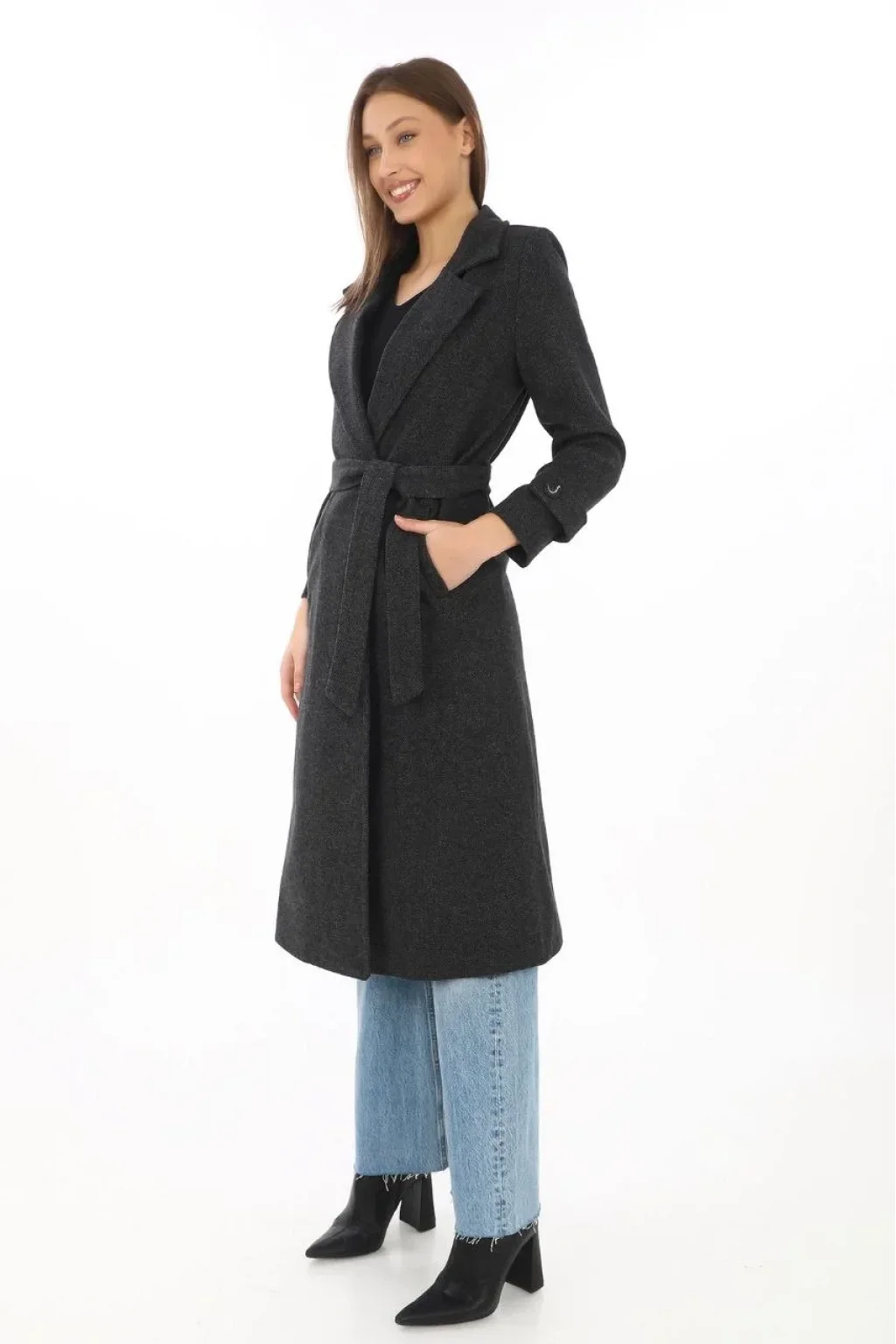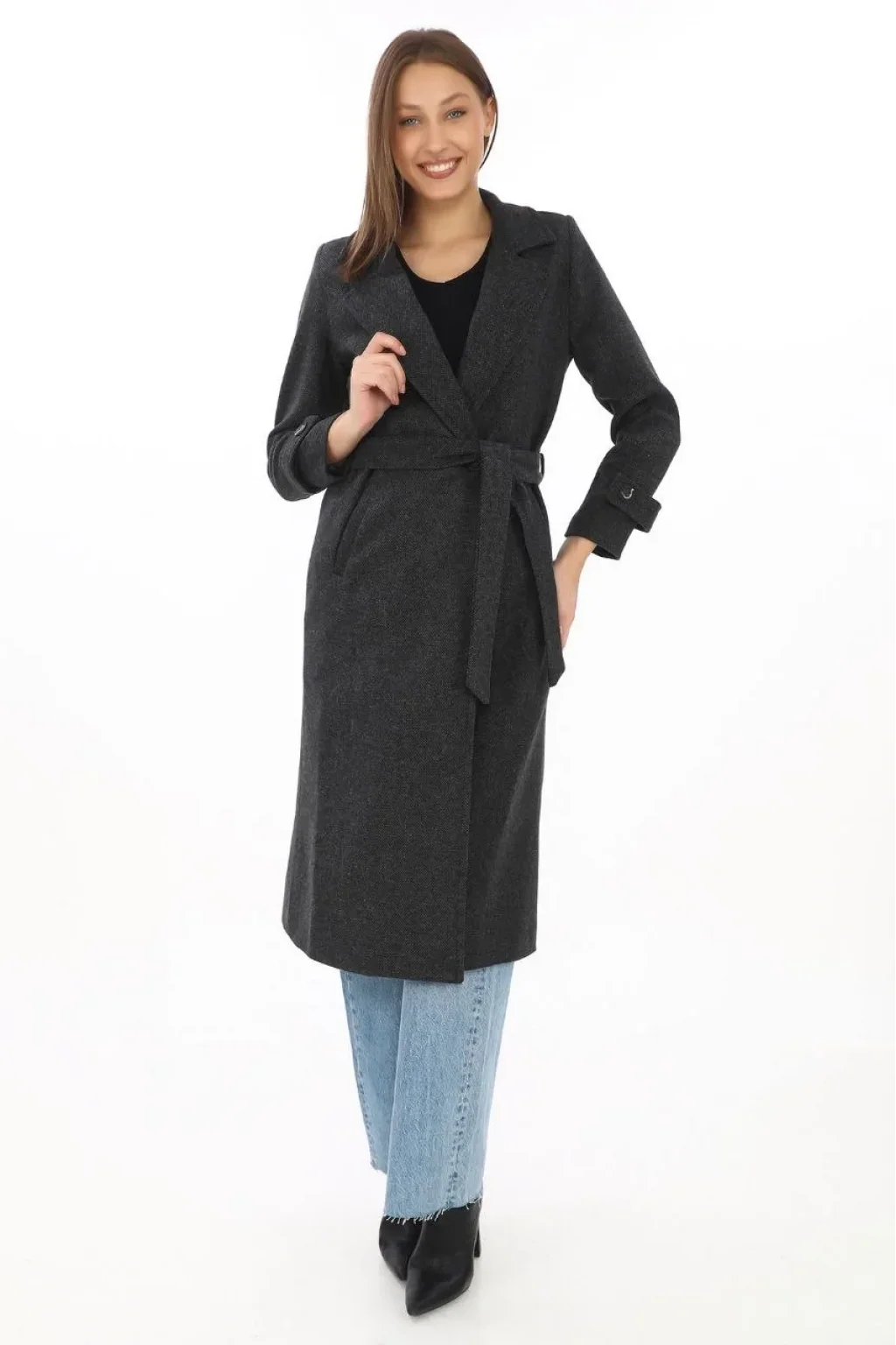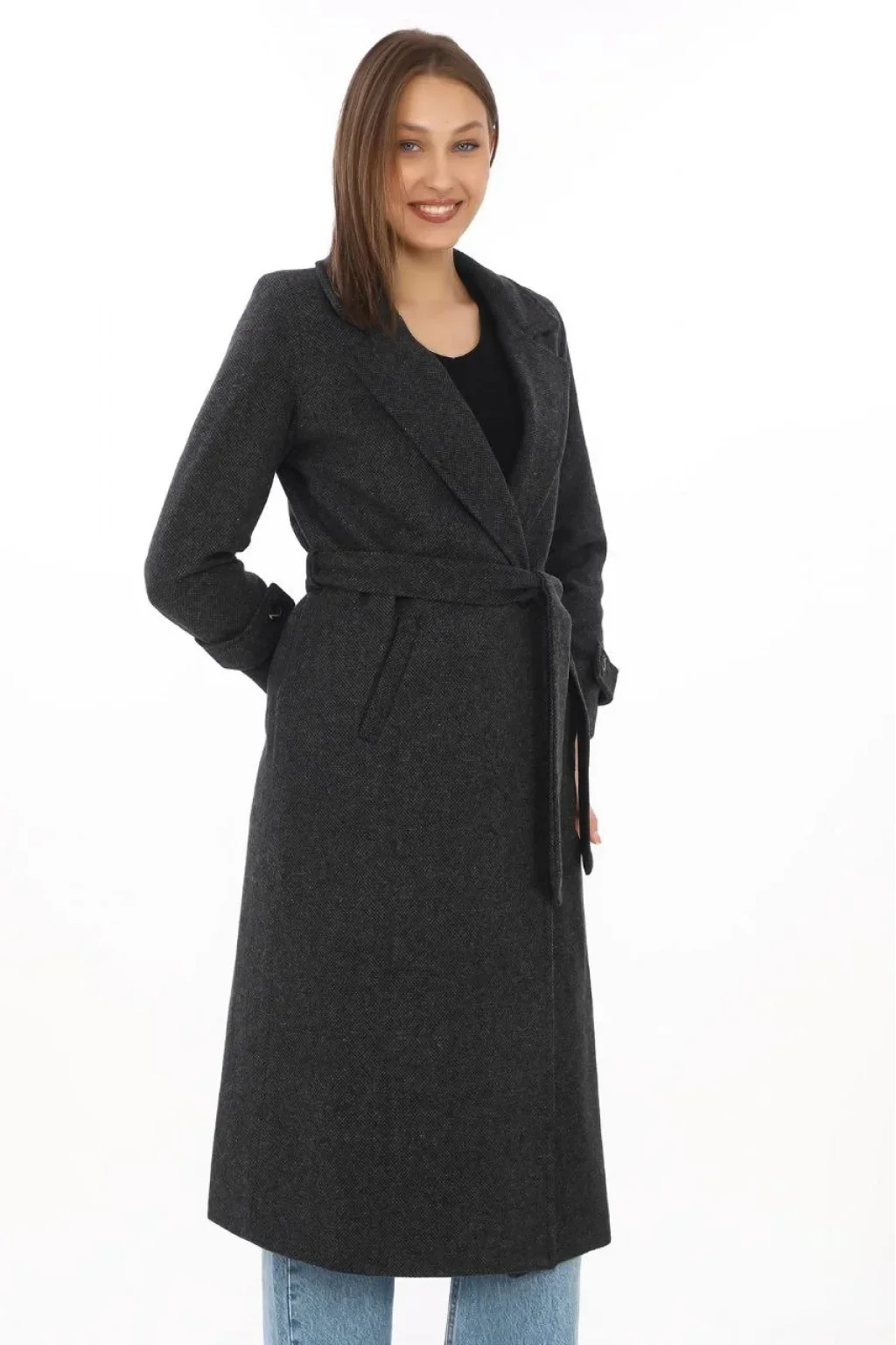 Kadın Balık Sırtı Kaşe Kaban – Uzun Boy Kruvaze Yaka Kuşaklı Astarlı Kışlık Tesettür Kaban, Yünlü Dokuma Kaşmir Kumaş, Cepli Rahat Oversize Kalıp Şık Modern Kaban Mont Modeli (Günlük ve Özel Gün Kombinlerine Uygun) - Siyah