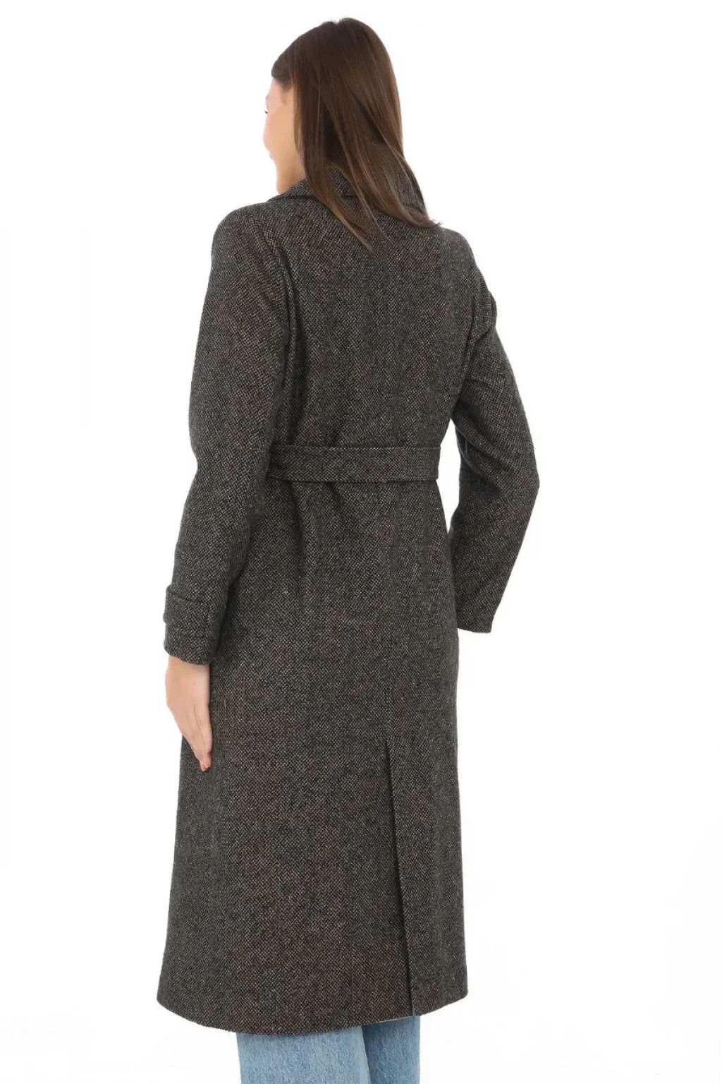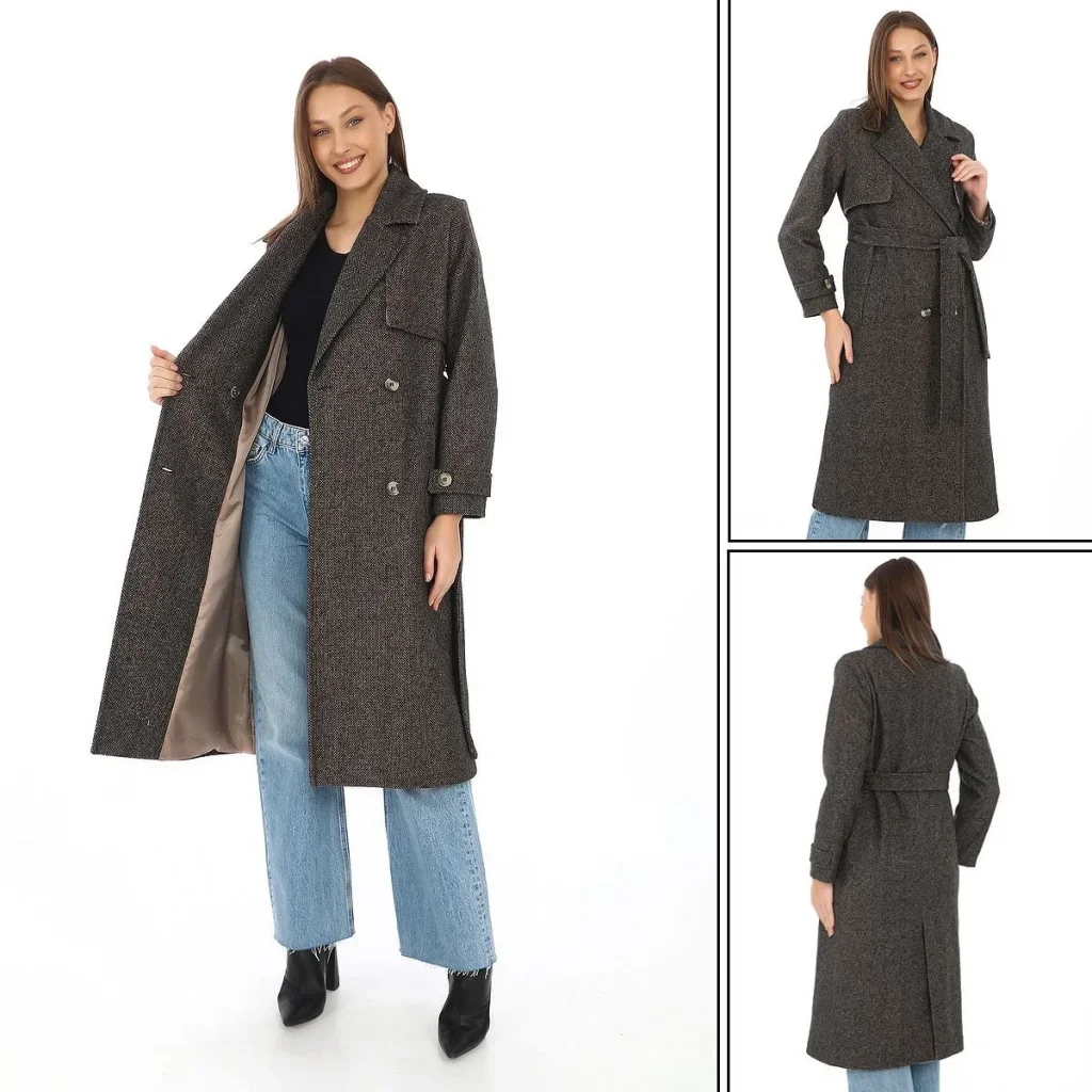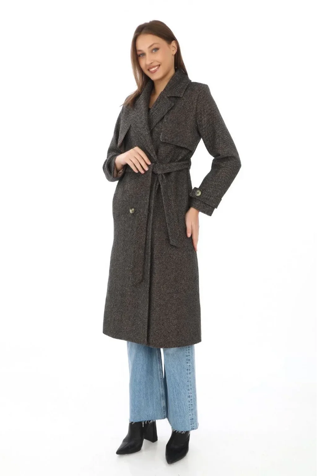 Kadın Balık Sırtı Yünlü Dokuma Kaşe Kaban – Kruvaze Yaka, Kuşaklı, Cepli, Astarlı Uzun Boy Tesettür Şık Kışlık Kaşe Kaban Modeli - Kahverengi