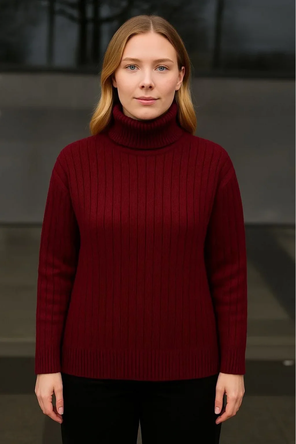 Kadın Balıkcı Yaka Bağazlı Triko Kazak Pamuklu Kalın Fitilli Dokuma - Bordo