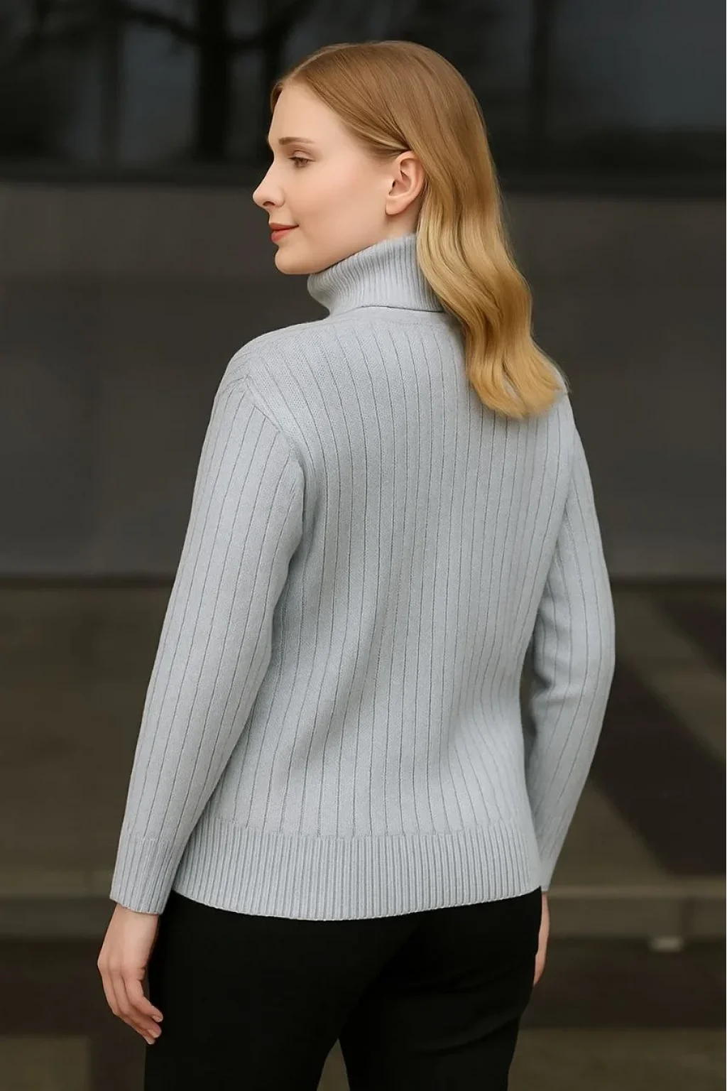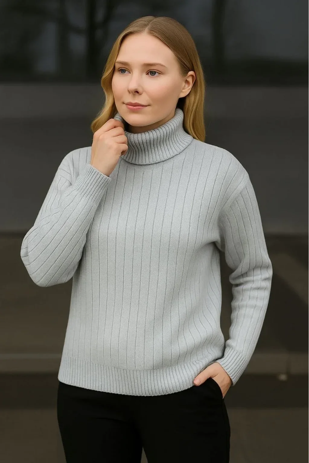 Kadın Balıkcı Yaka Bağazlı Triko Kazak Pamuklu Kalın Fitilli Dokuma - Gri