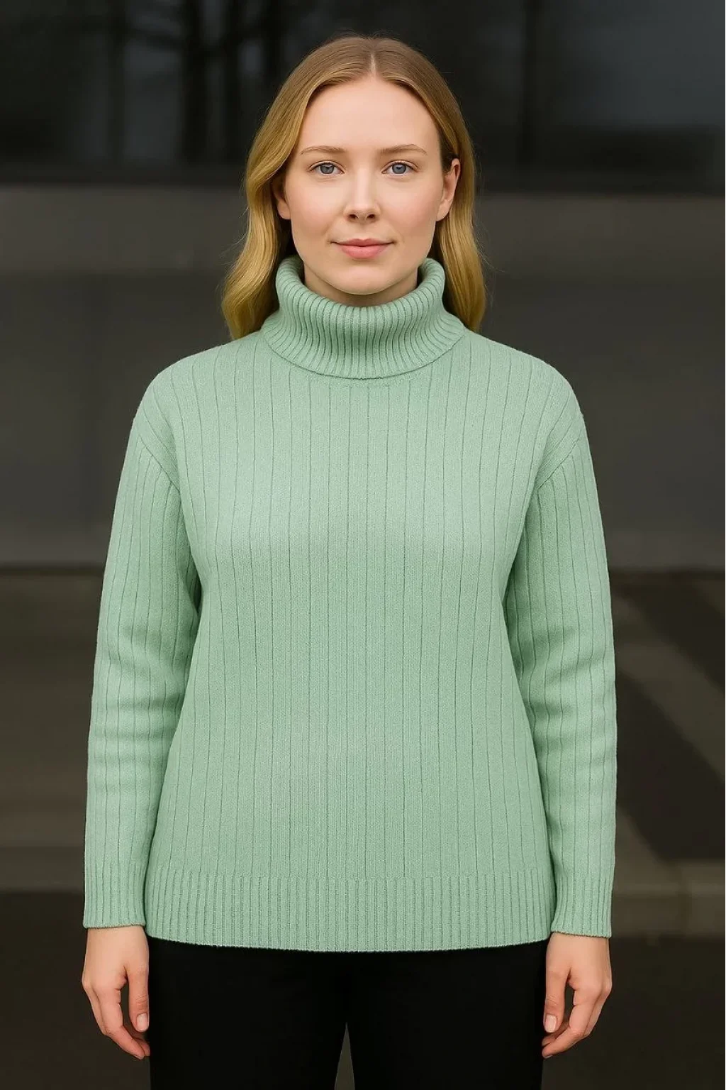 Kadın Balıkcı Yaka Bağazlı Triko Kazak Pamuklu Kalın Fitilli Dokuma - Mint Yeşili