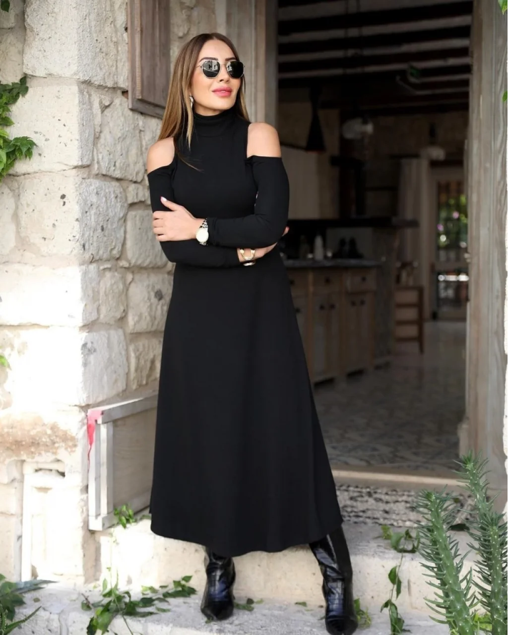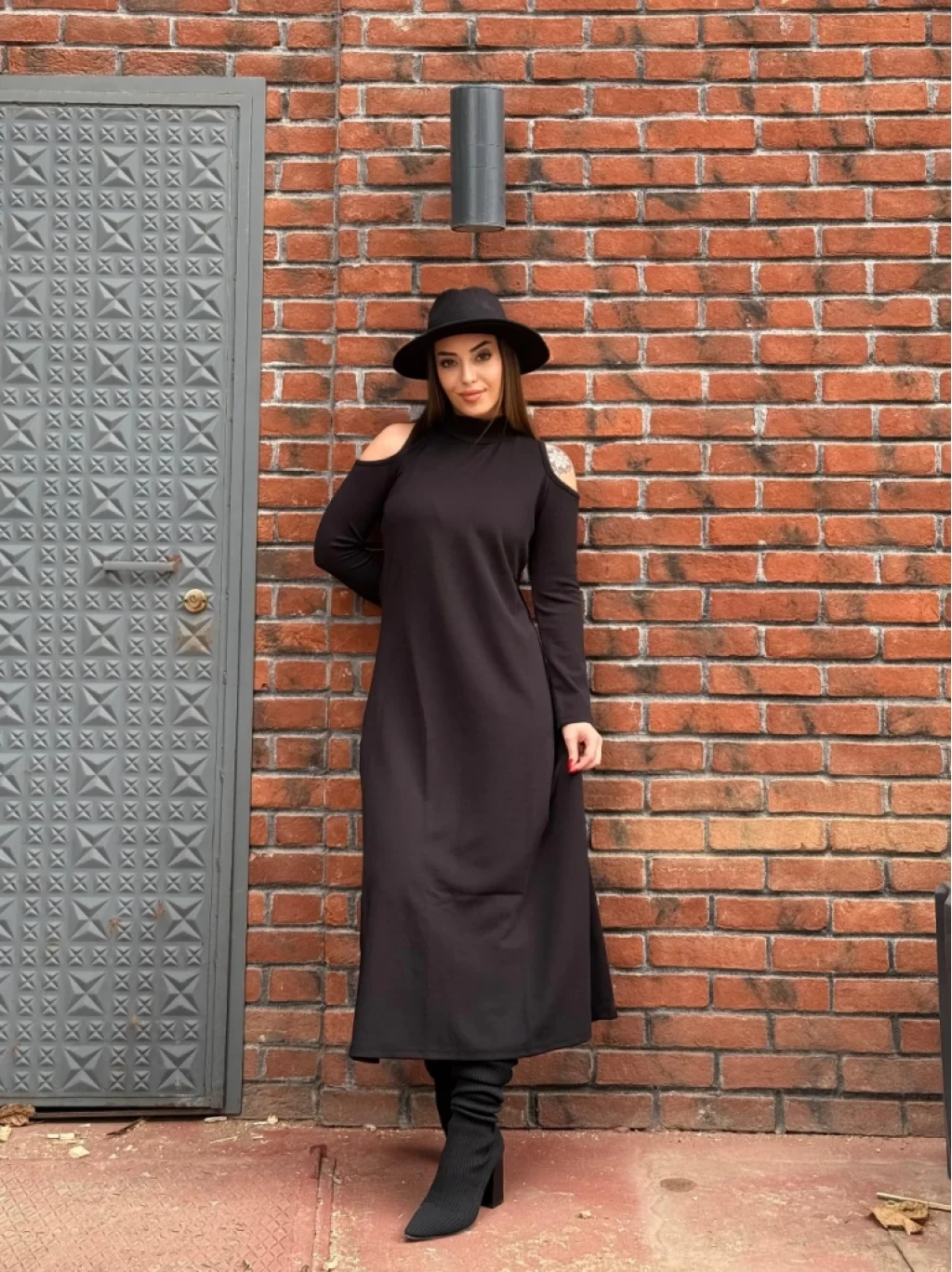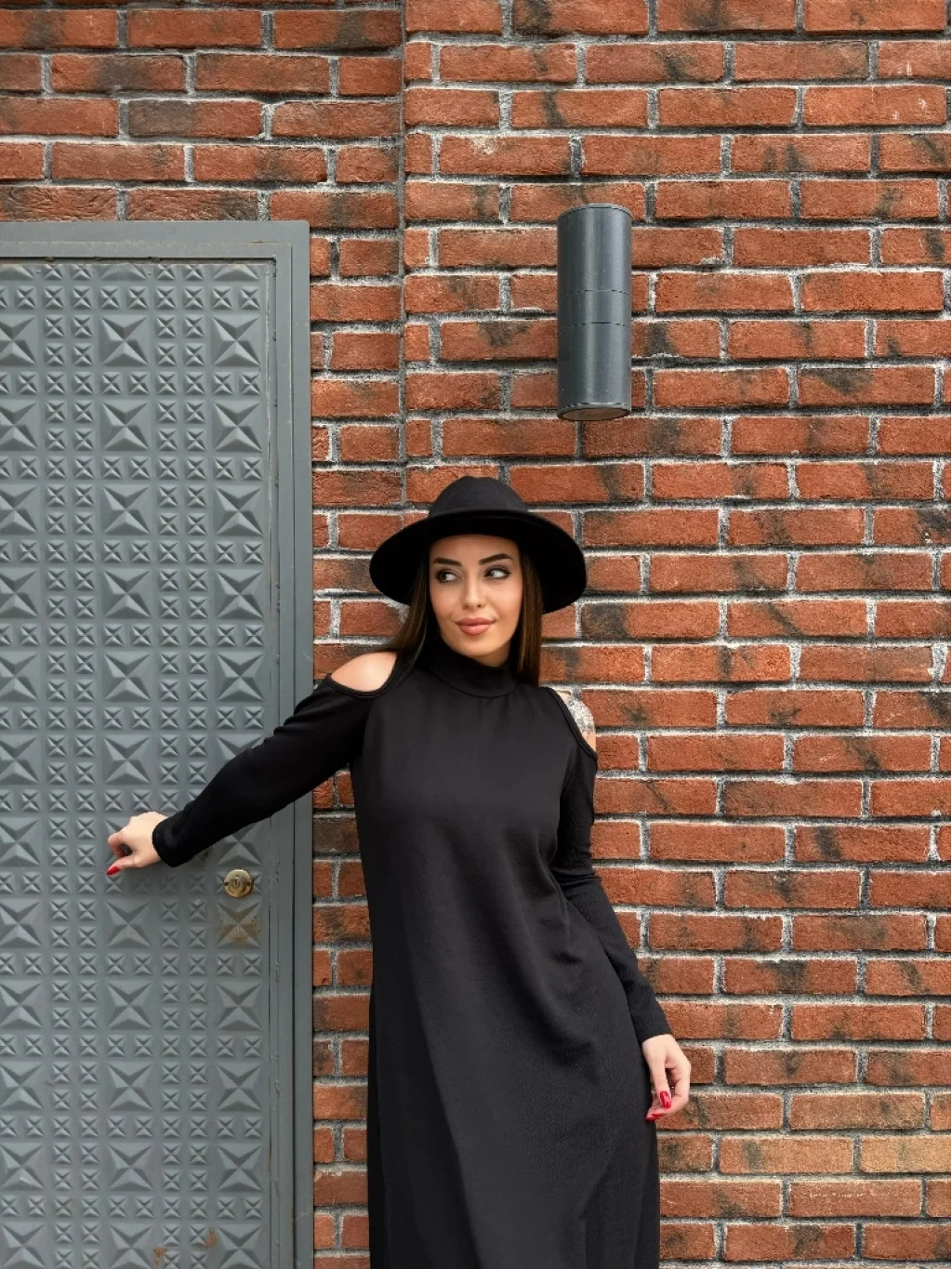 Kadın Balıkçı Yaka Omuzlardan Açık Uzun Kollu Janjan Krep Elbise