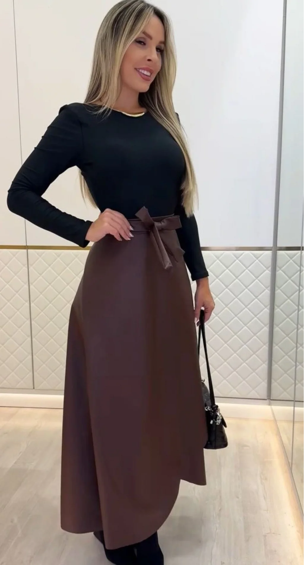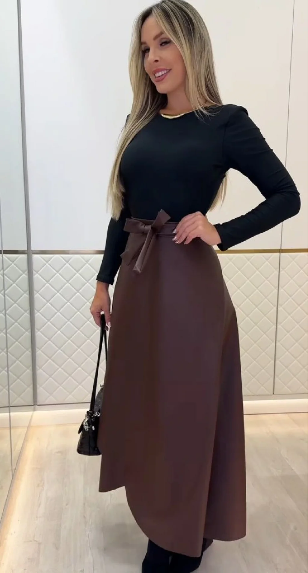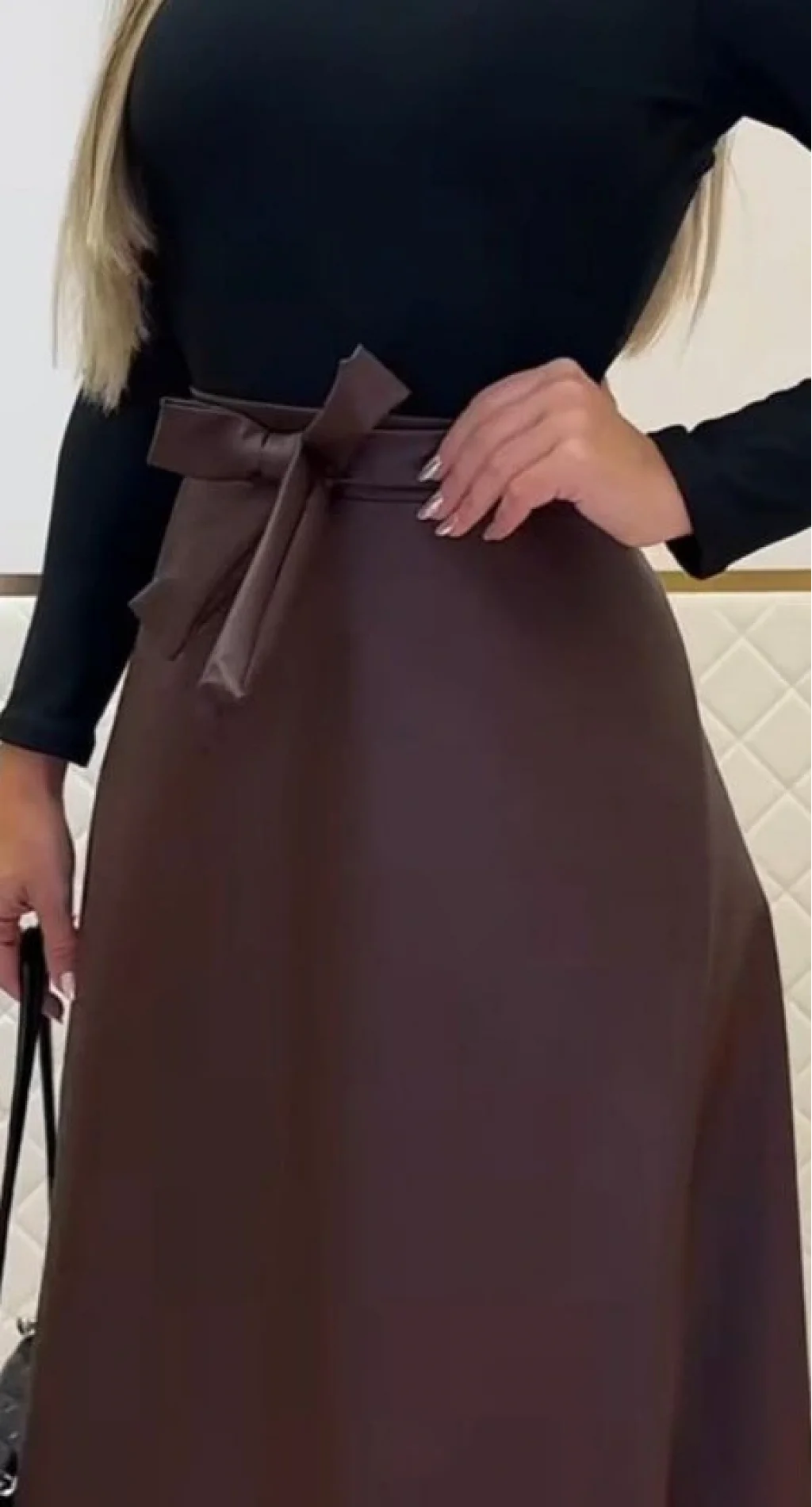 Kadın Belden Kuşaklı Uzun Deri Etek