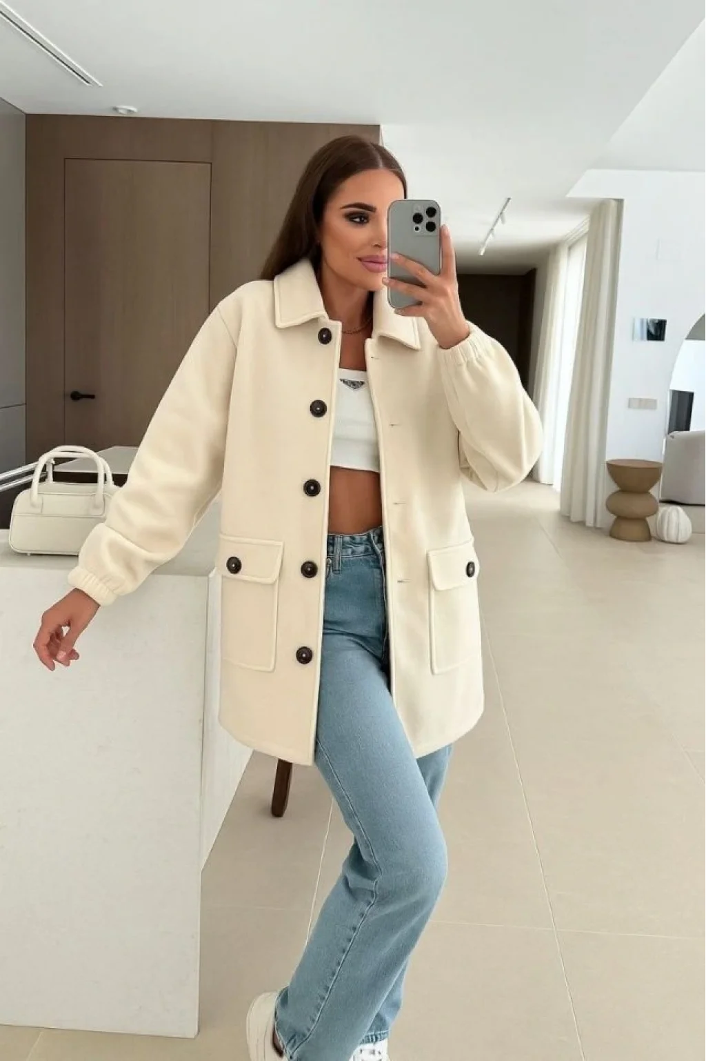 Kadın Bileği Lastikli Cep Ve Leopar Düğme Detay Kaşe Kaban