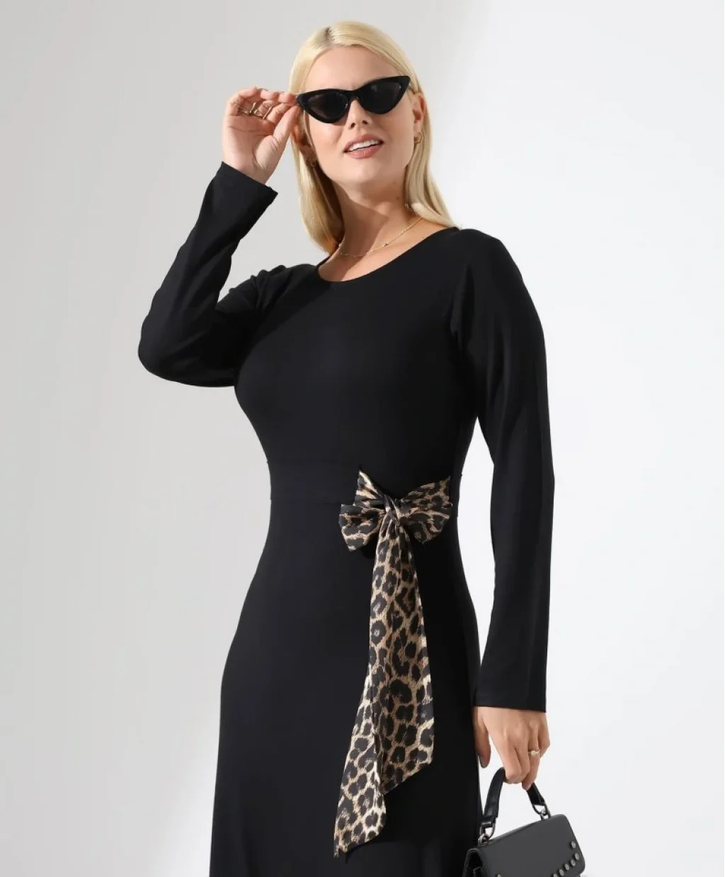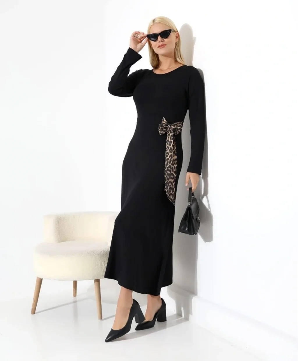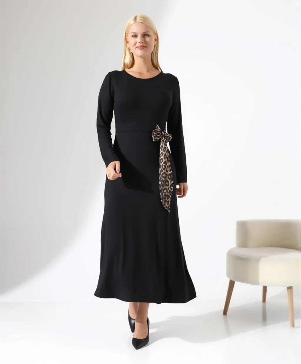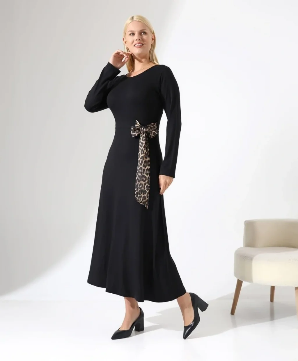 Kadın Bisiklet Yaka Leopar Fiyonk Detay Maxi Boy Elbise