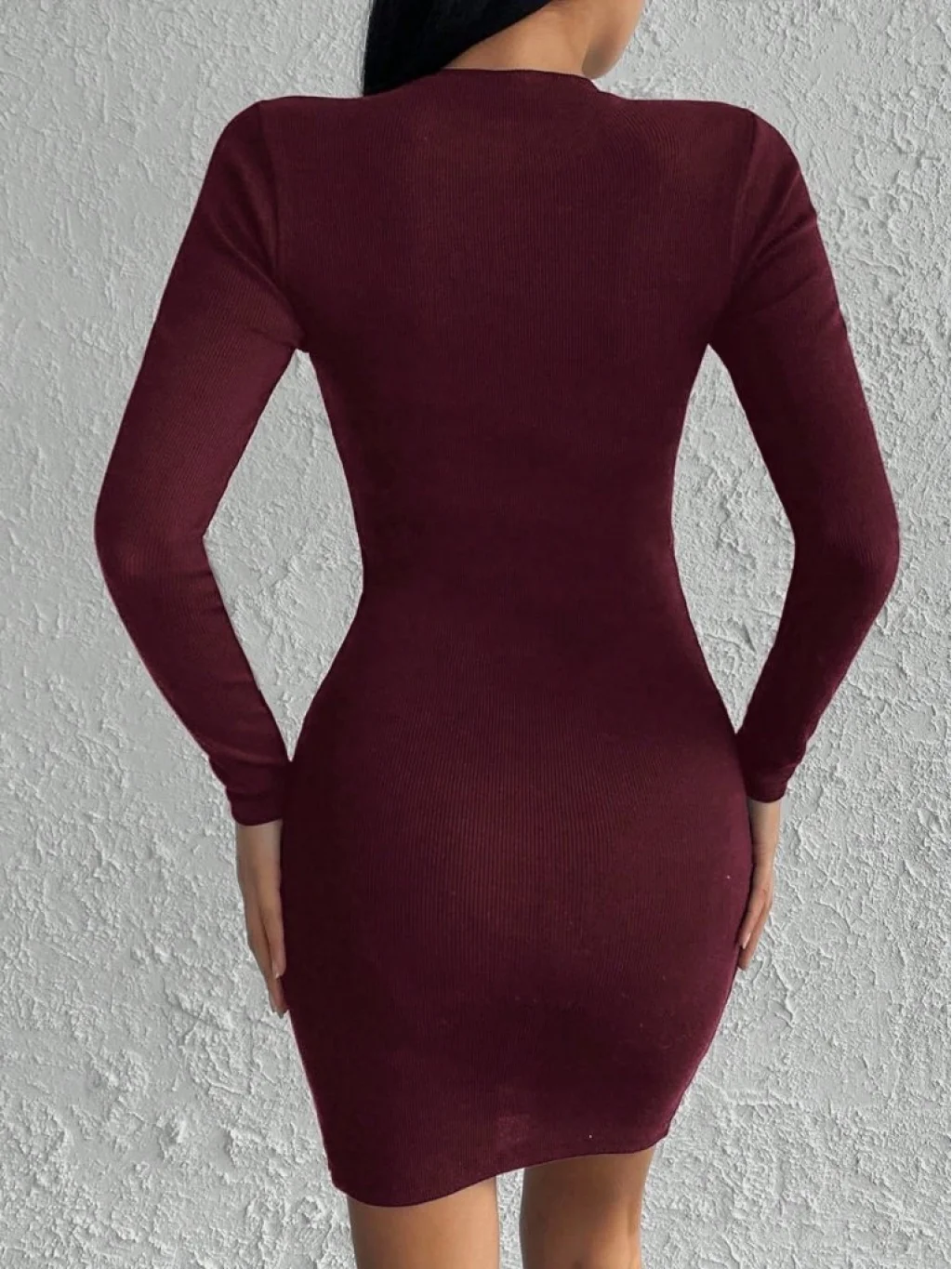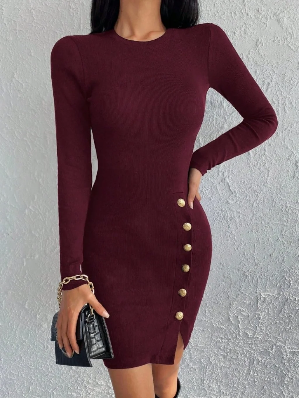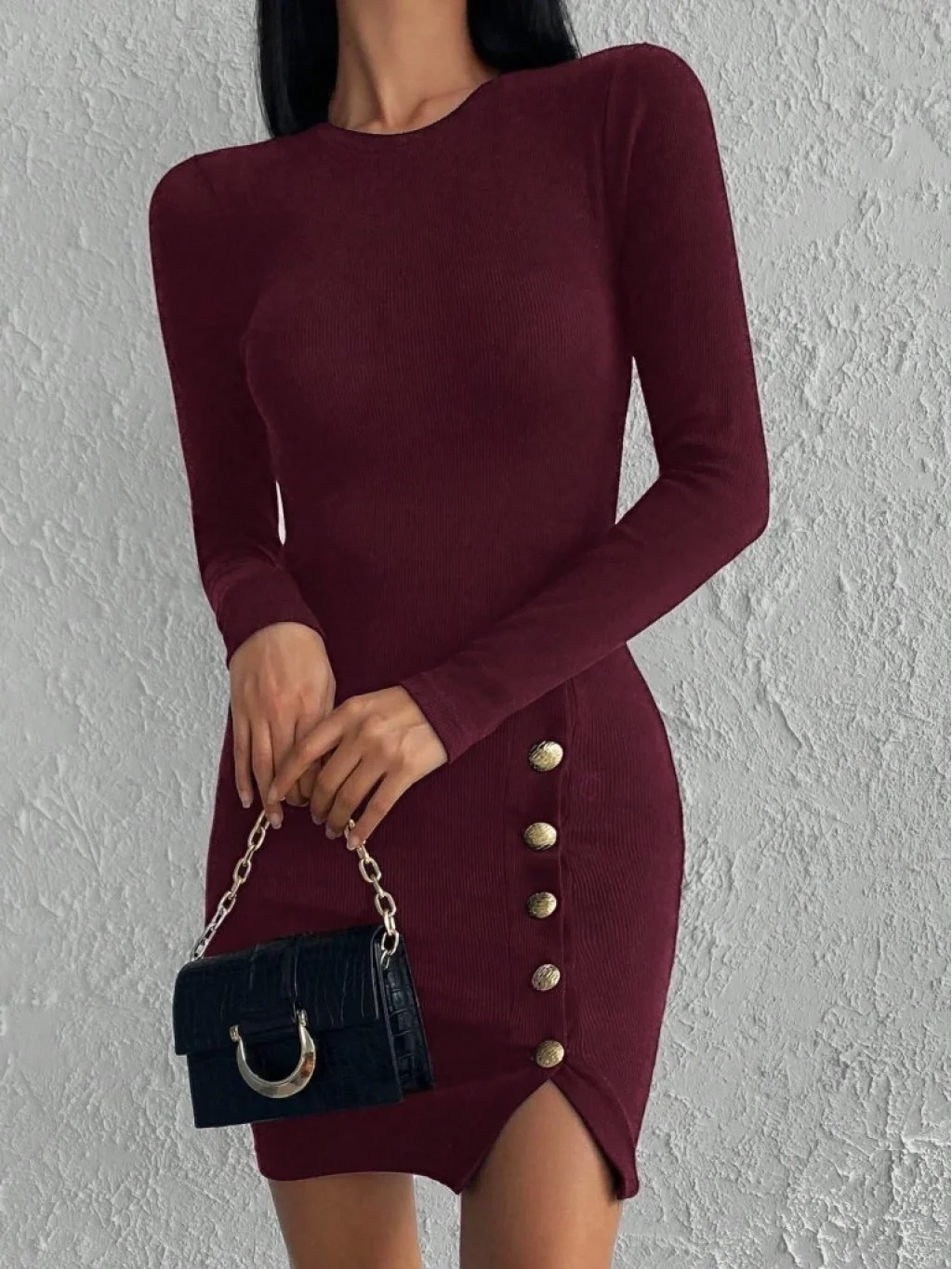 Kadın Bordo Uzun Kollu Bisiklet Yaka Yan Yırtmaç Düğme Detay Kısa Kaşkorse Elbise