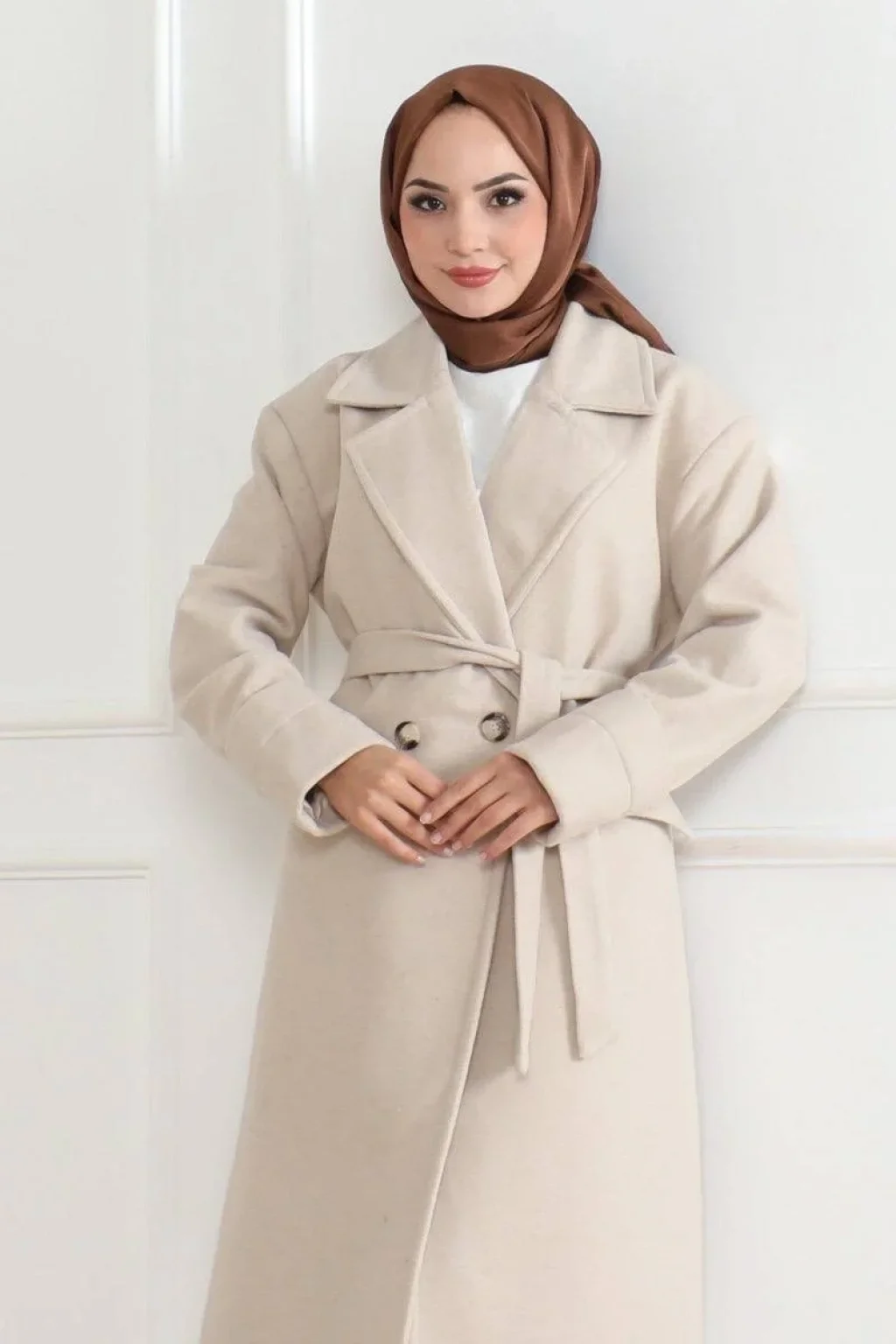Kadın Düğmeli İçi Astarlı Kaşmir Kaşe Kaban - Bej