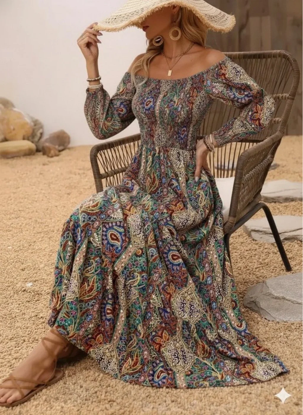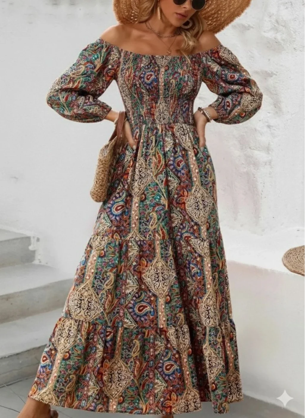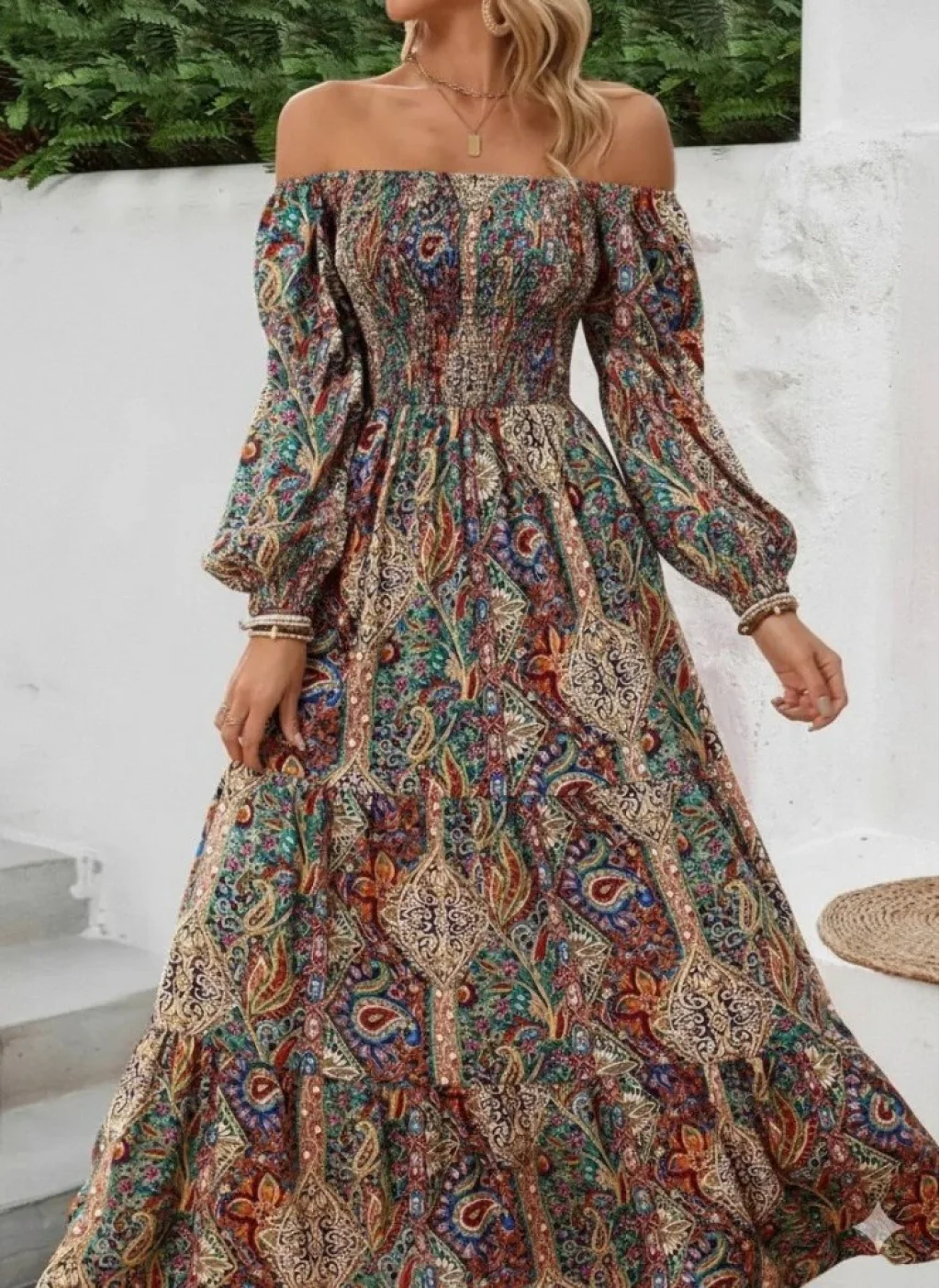 Kadın Düşük Omuzlu Beli Büzgülü Dijital Desenli Kesik Elyaf Süprem Uzun Elbise