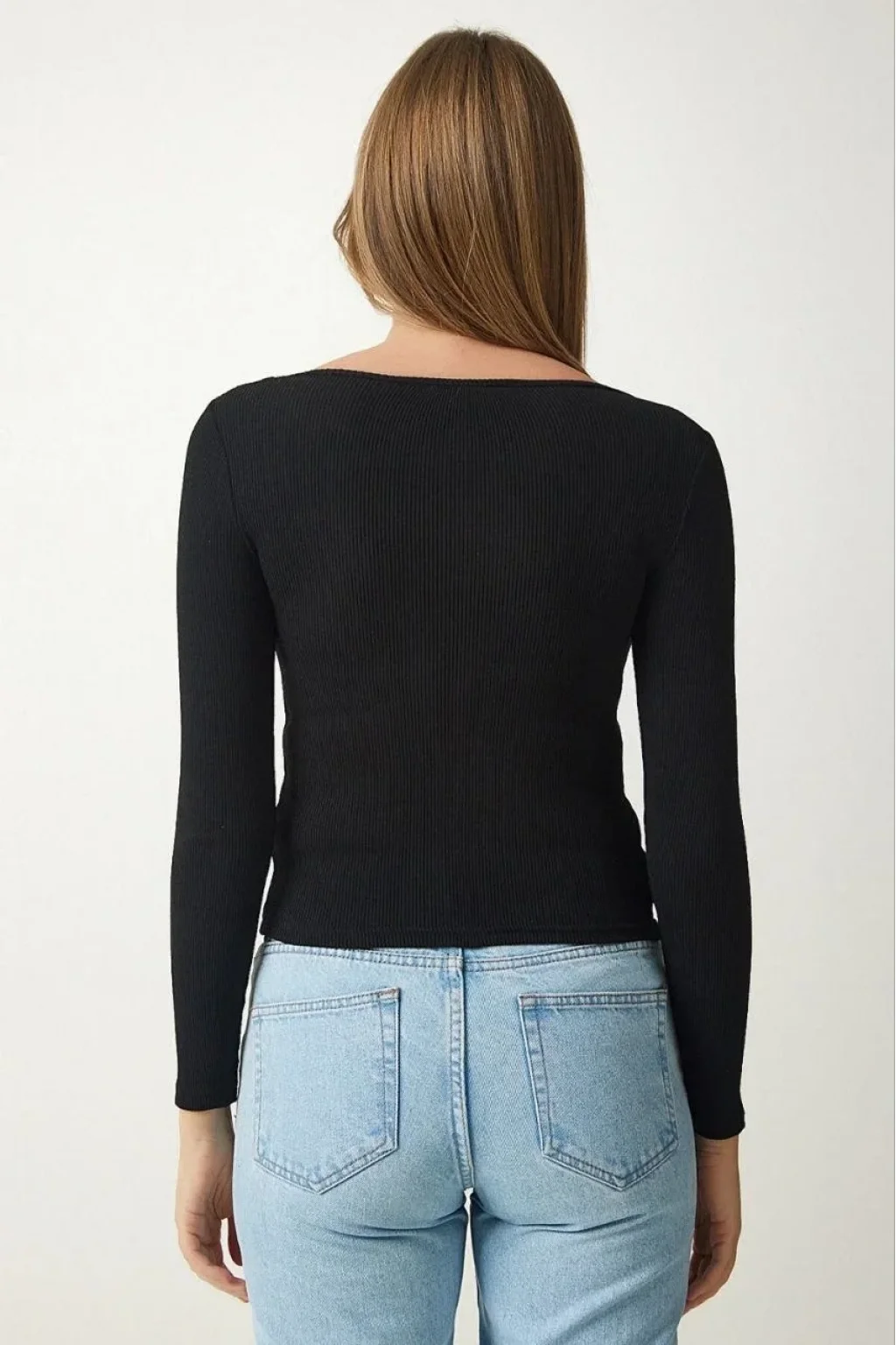 • Kadın Fitilli Likralı Body Crop - Siyah