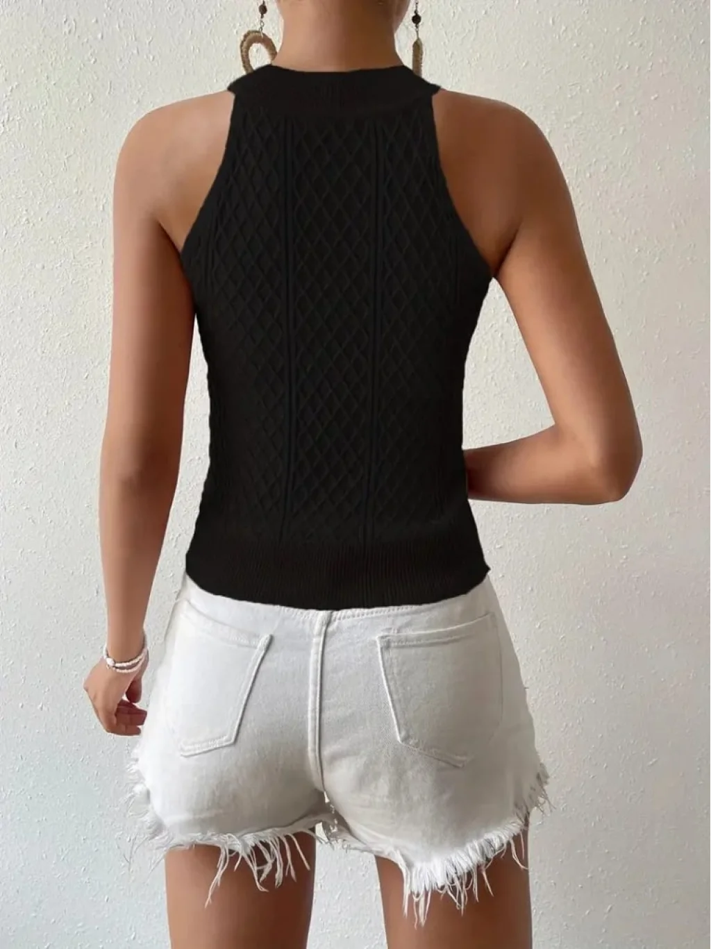 Kadın Halter Yaka Mini Baklava Desenli Triko Bluz