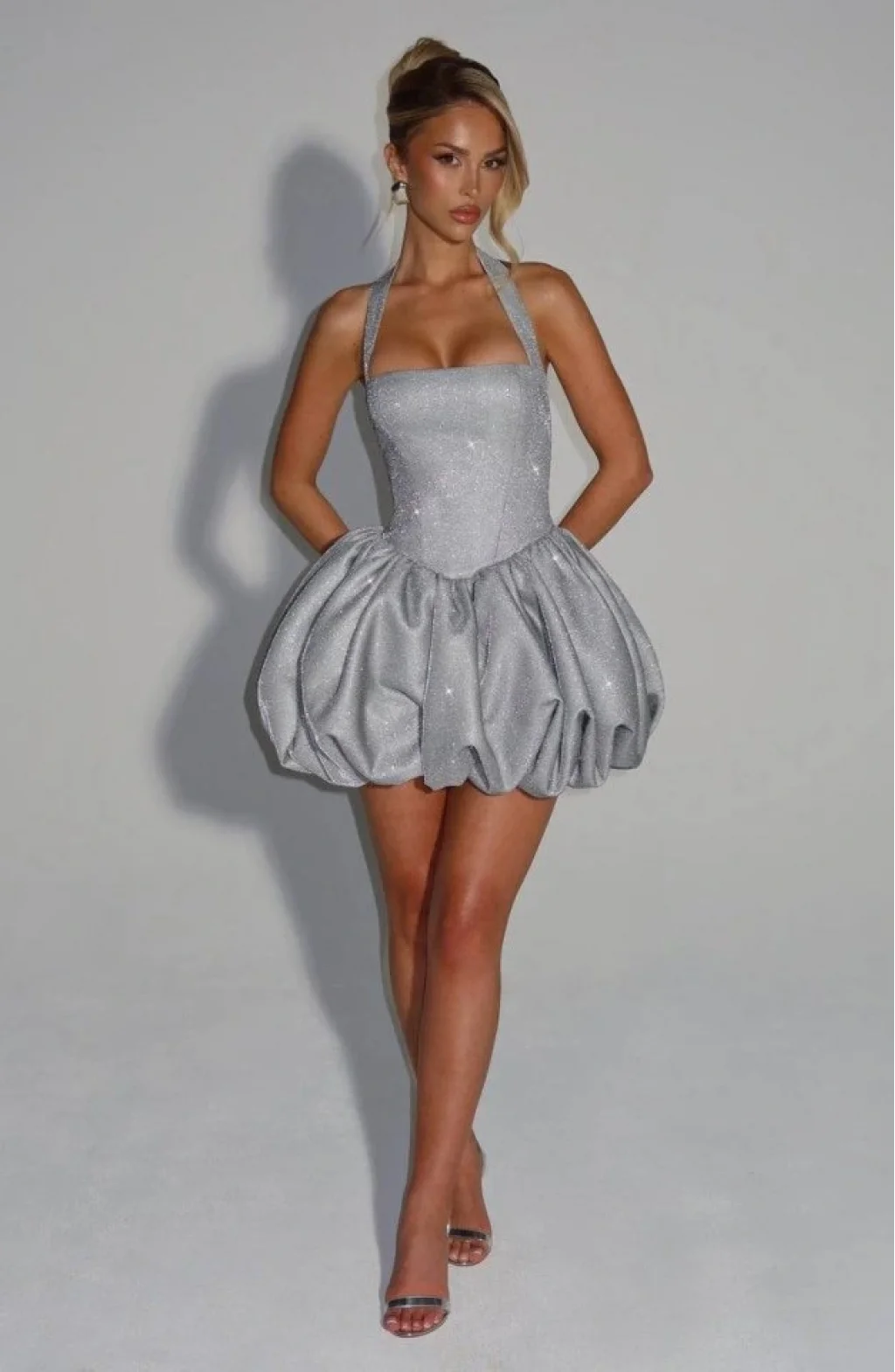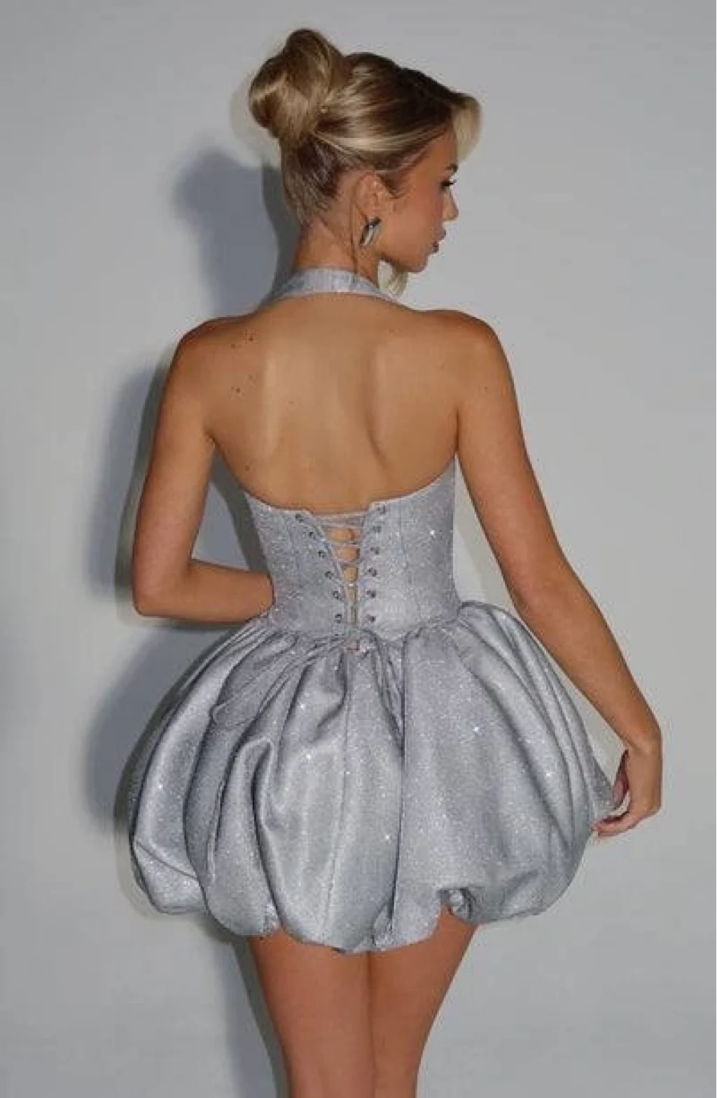 Kadın Halter Yaka Simli Kumaş Sırtı Bağcık Detay Prenses Elbise