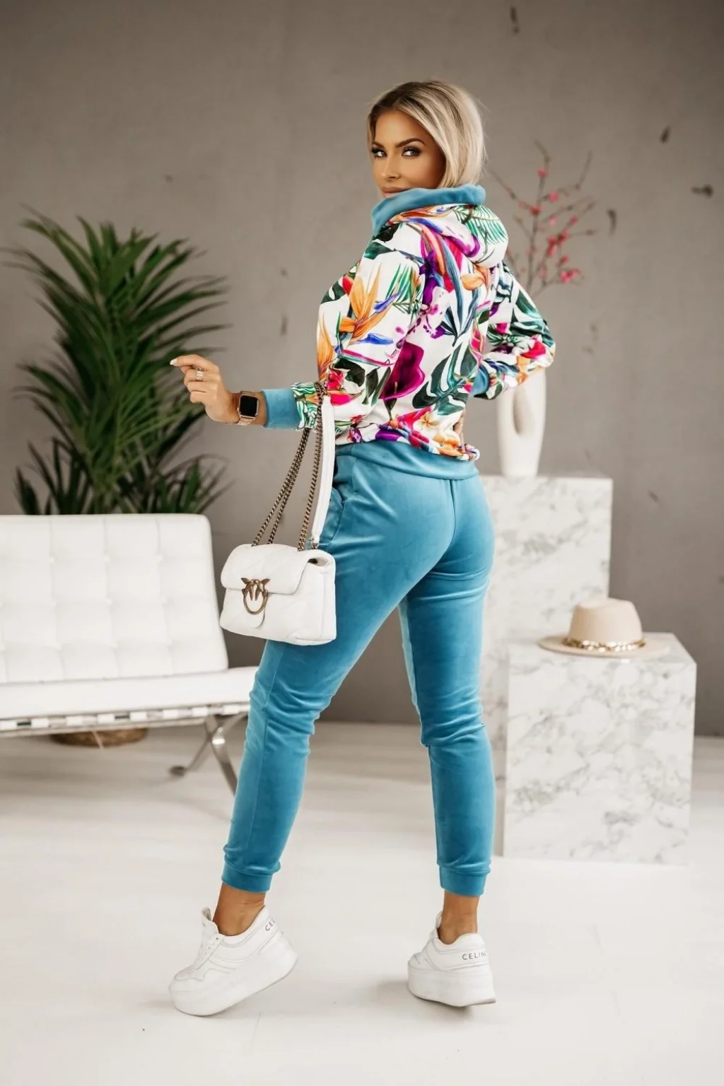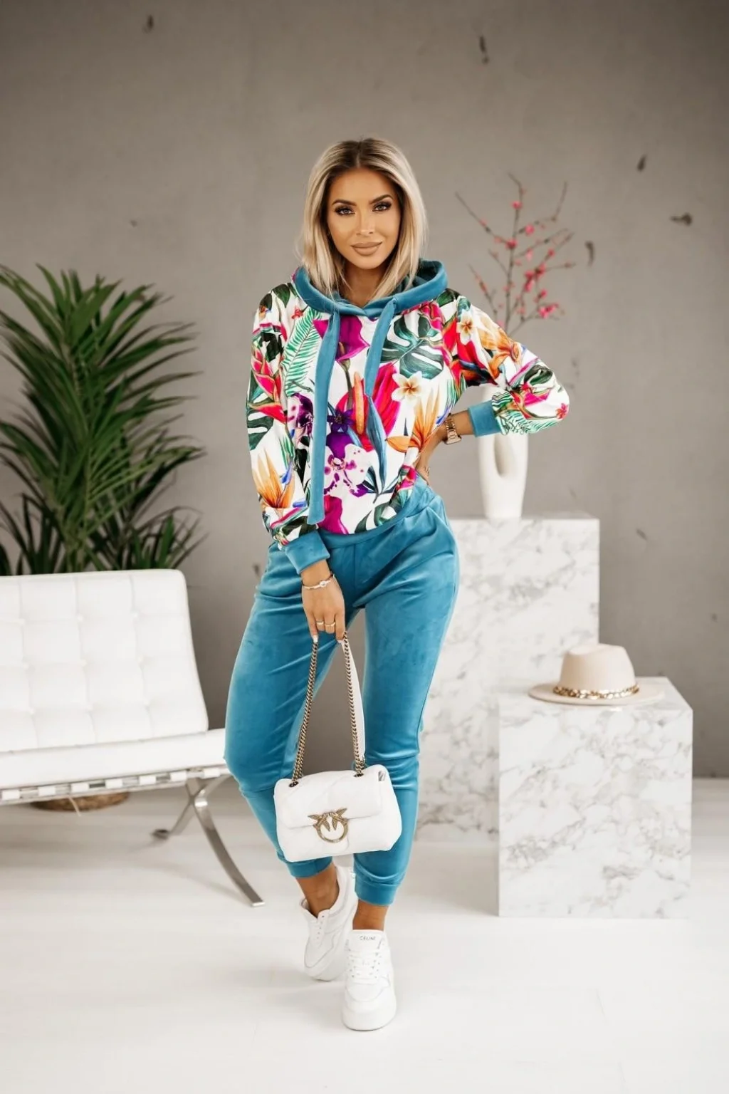 Kadın Kadife Kumaş Uzun Kollu Kapüşon Detay çiçek Baskılı Sweat Ve Pantolon Ikili Takım