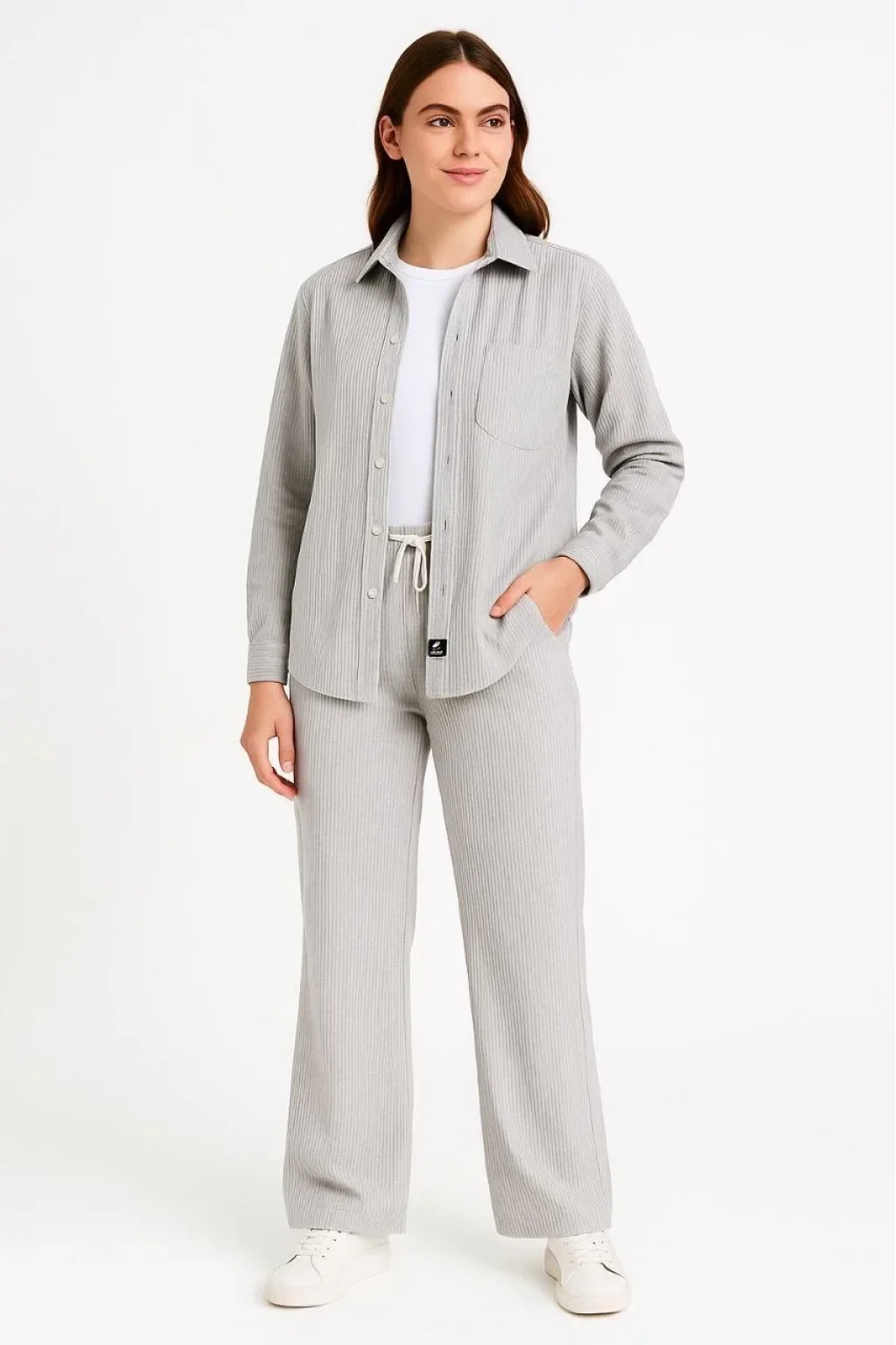 Kadın Kadife Oversize Takım – Gömlek ve Pantolon İkili Set Füme Corduroy Şıklığı, Rahat ve Zarif Duruş Yumuşak Dokulu Kadife Kumaş, Düğmeli Gömlek Üst ve Lastikli Pantolon Alt Parça ile Gün Boyu Konfor- Gri