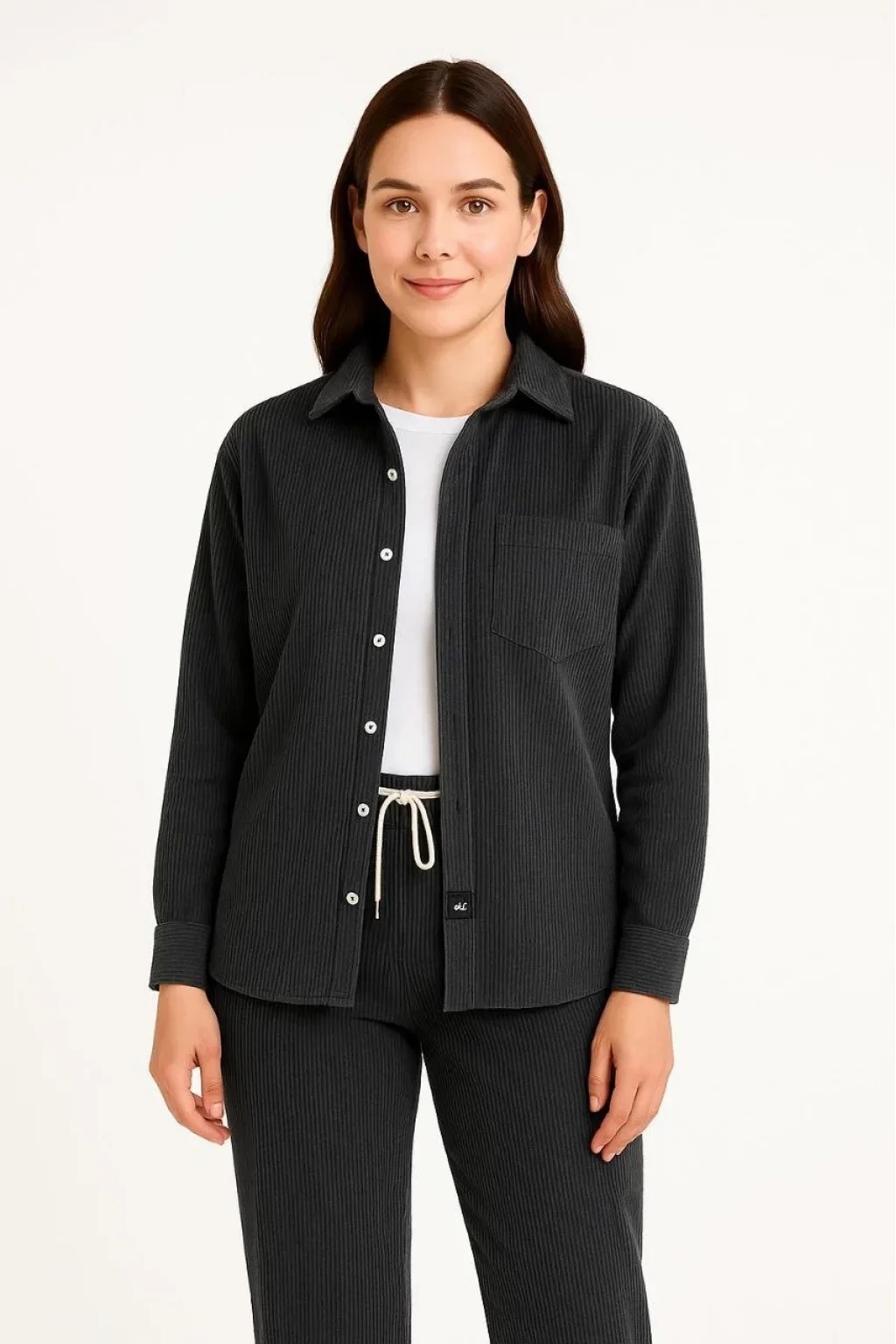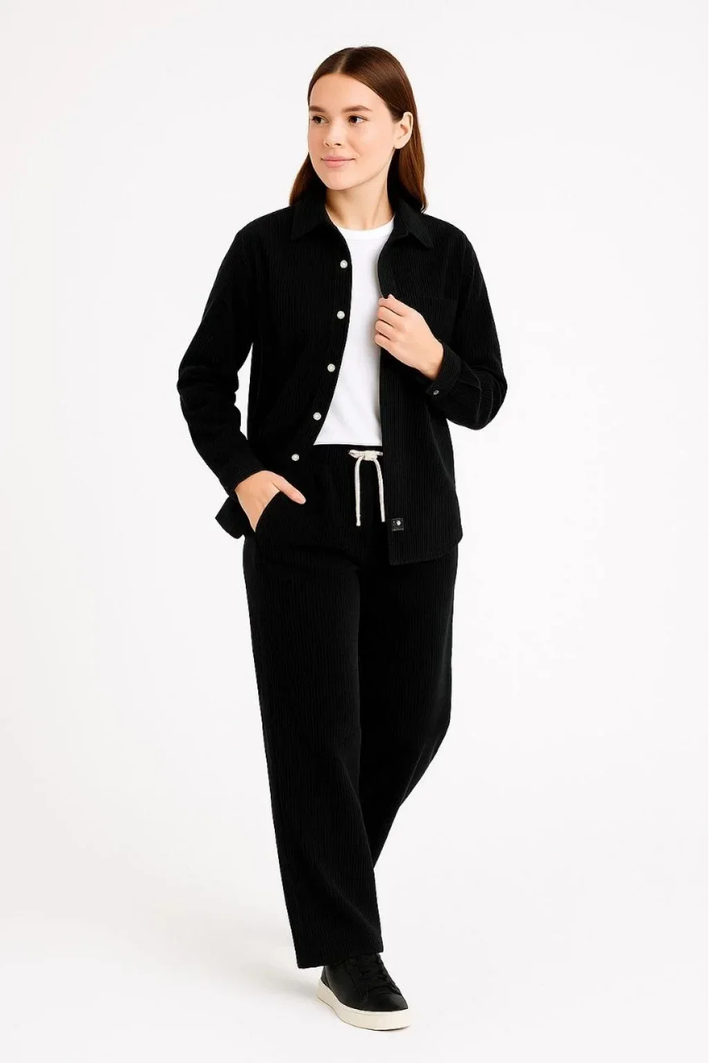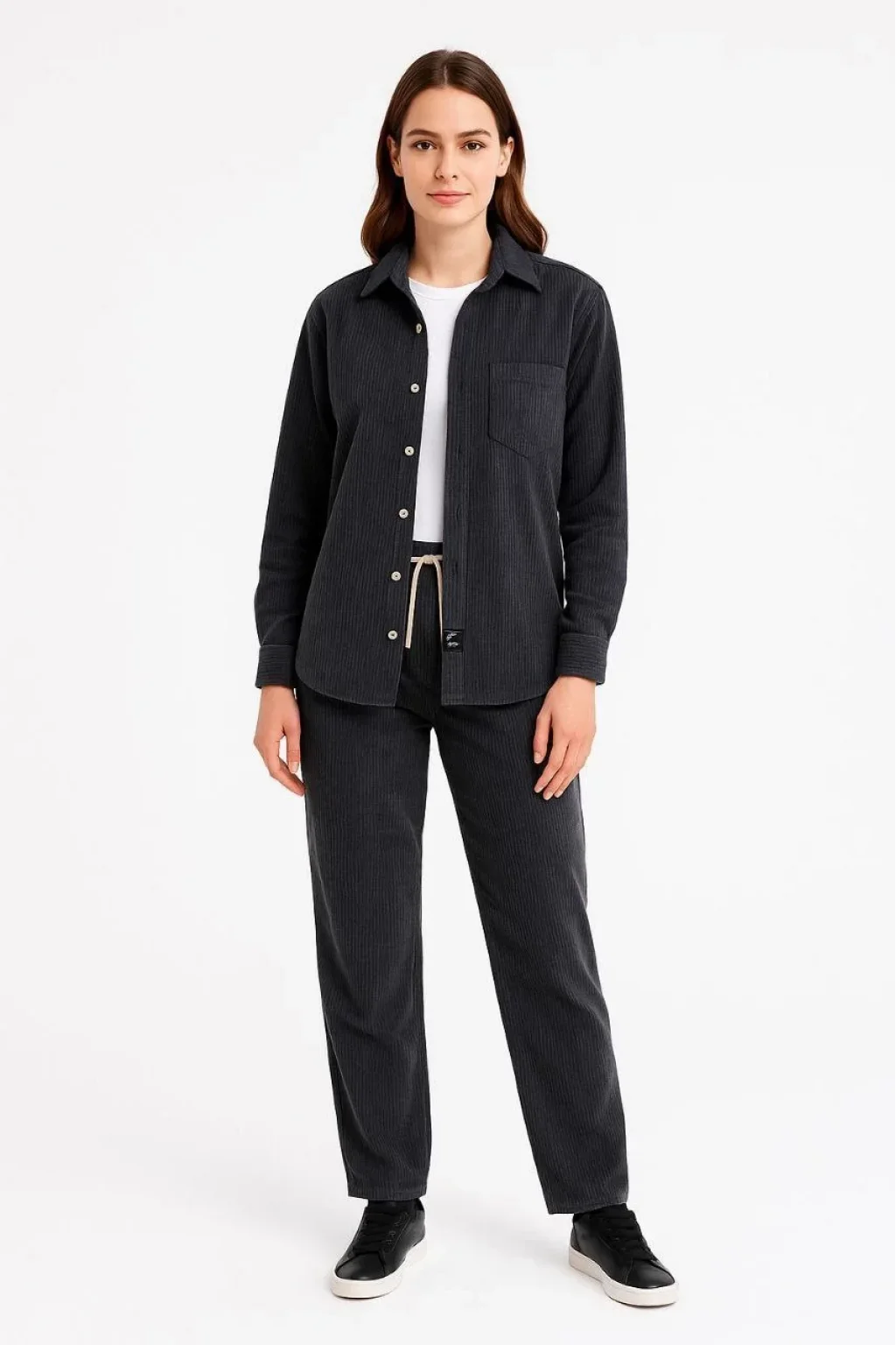 Kadın Kadife Oversize Takım – Gömlek ve Pantolon İkili Set Füme Corduroy Şıklığı, Rahat ve Zarif Duruş Yumuşak Dokulu Kadife Kumaş, Düğmeli Gömlek Üst ve Lastikli Pantolon Alt Parça ile Gün Boyu Konfor- Siyah
