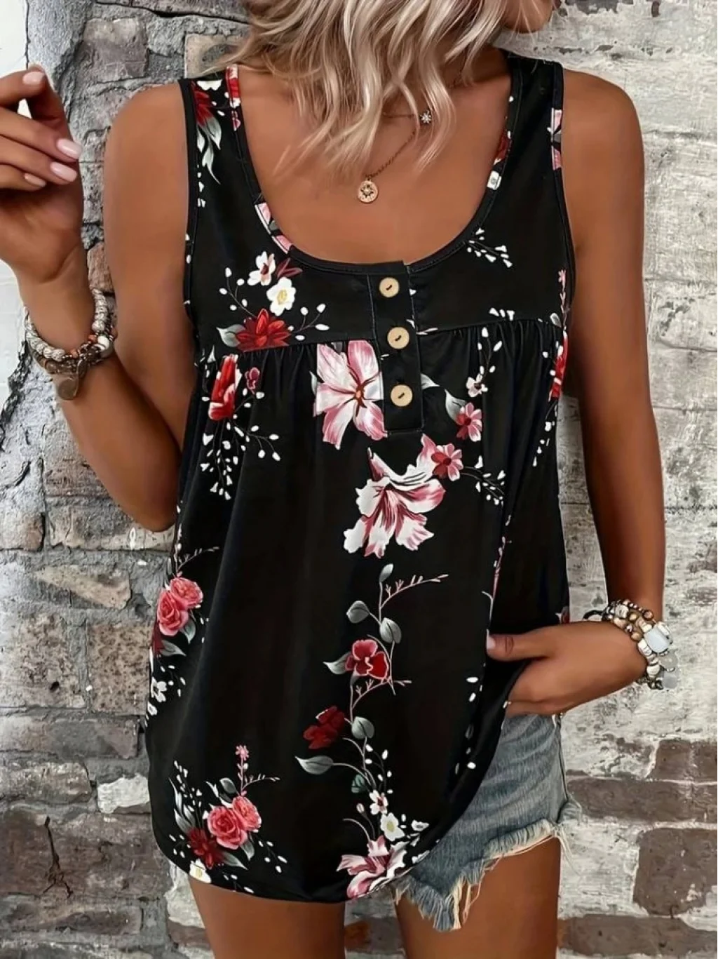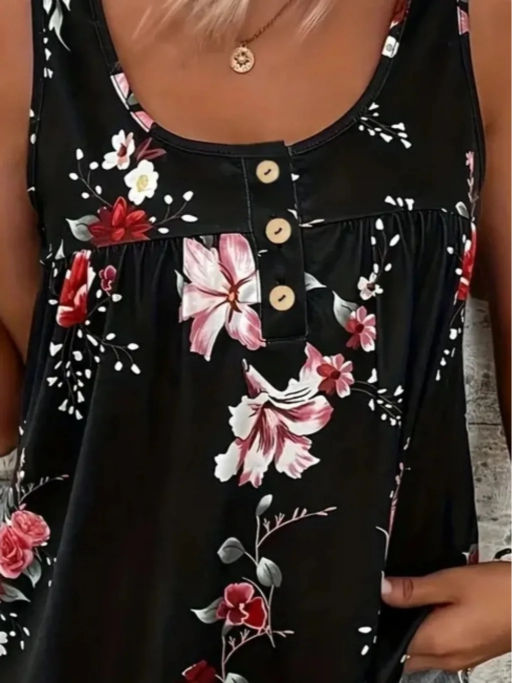 Kadın Kalın Askılı önü Düğme Detay çiçek Desen Bluz