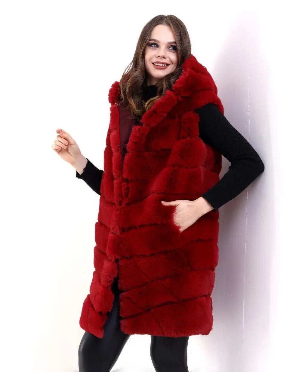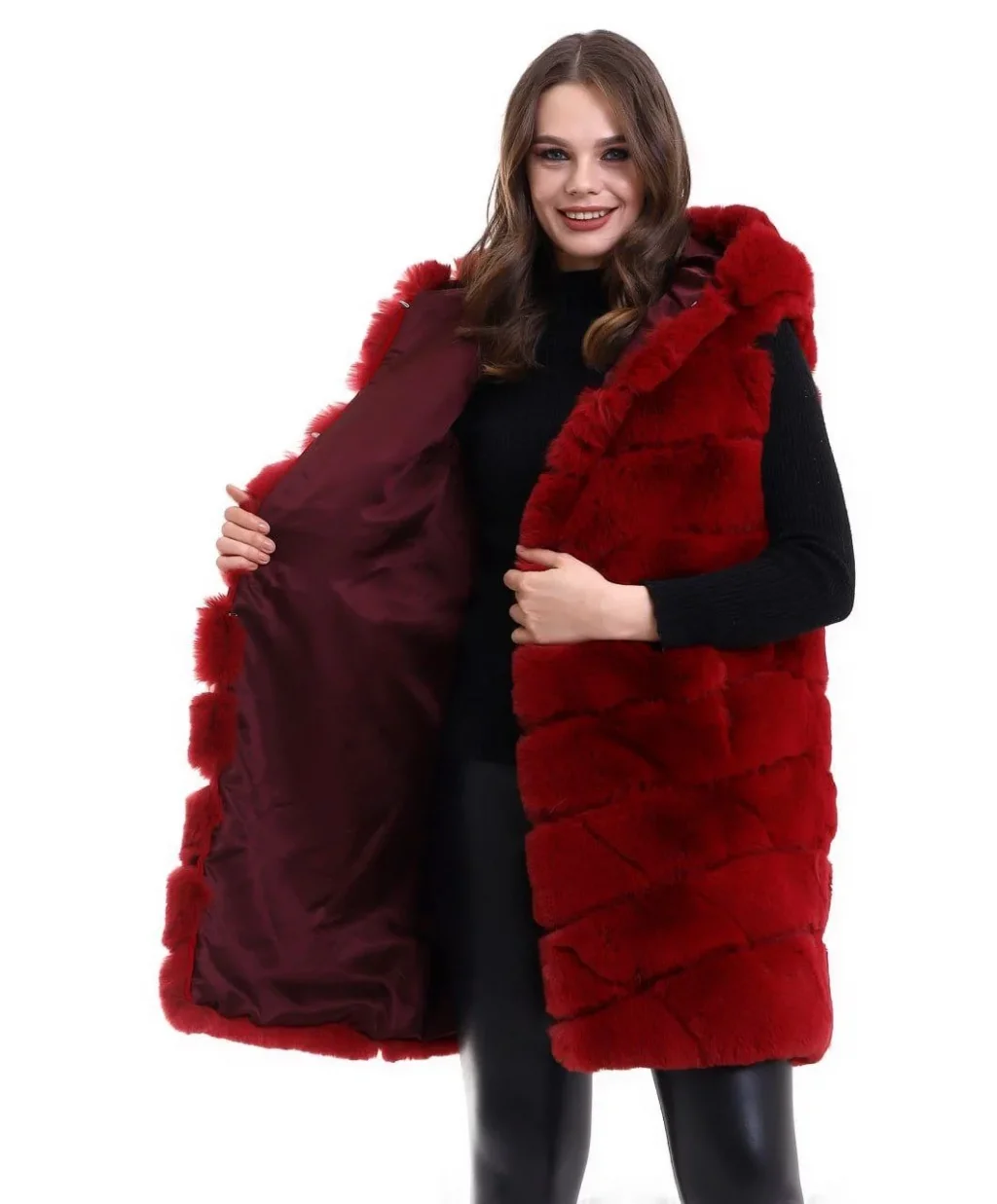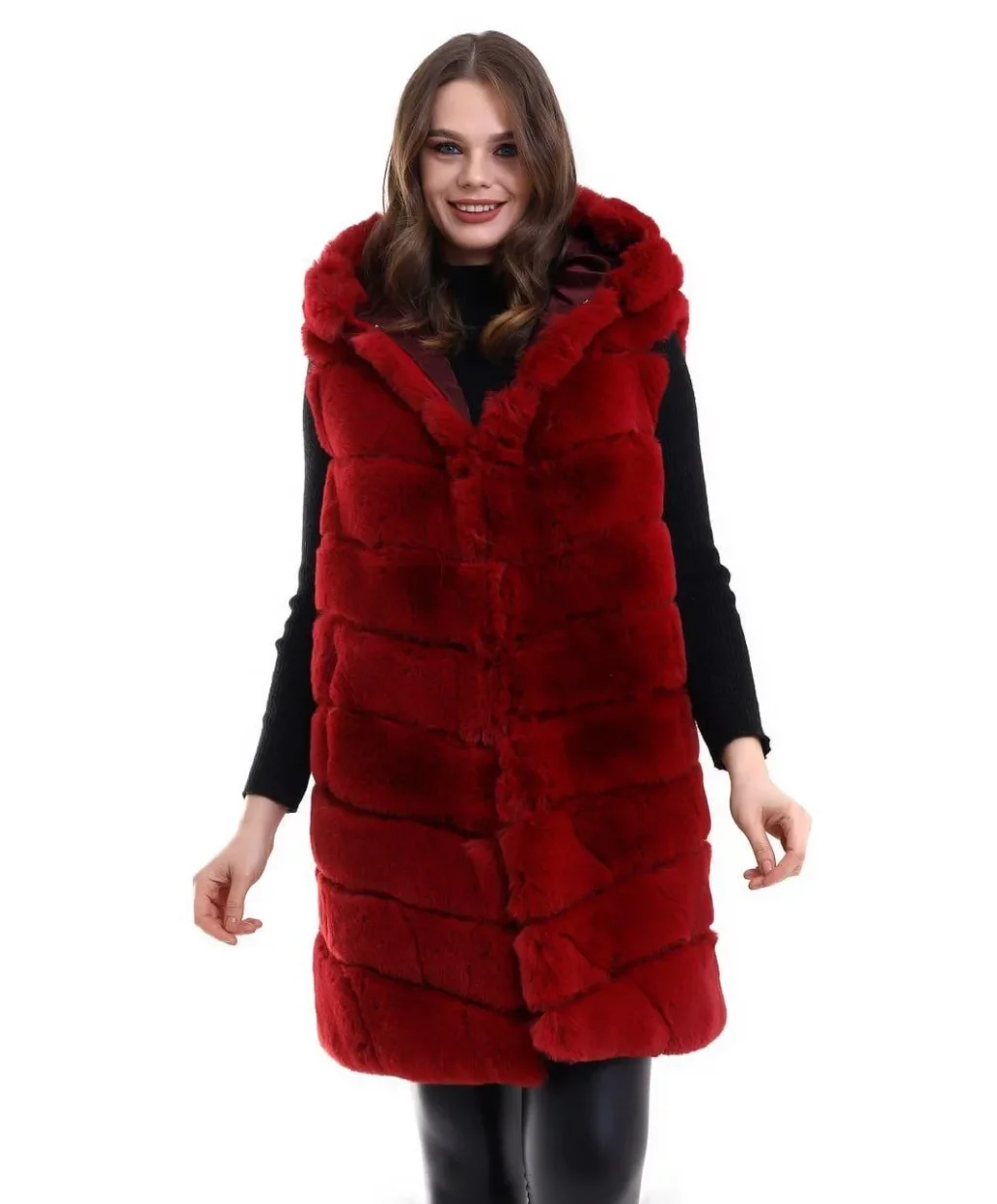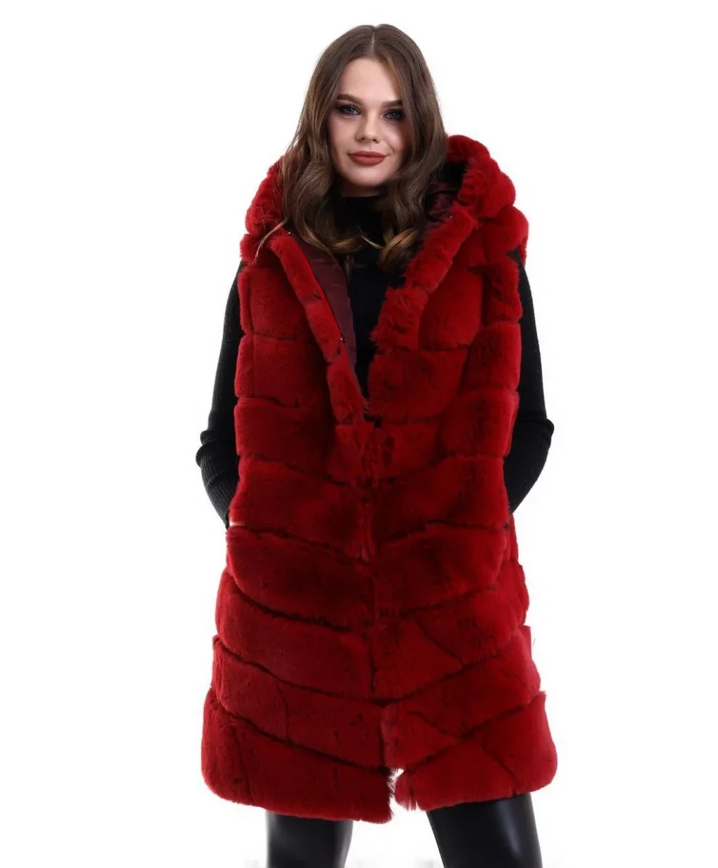 Kadın Kapşonlu Peluş Kürk Yelek Premium Kalite, Tam Astarlı, Uzun Model - Kırmızı