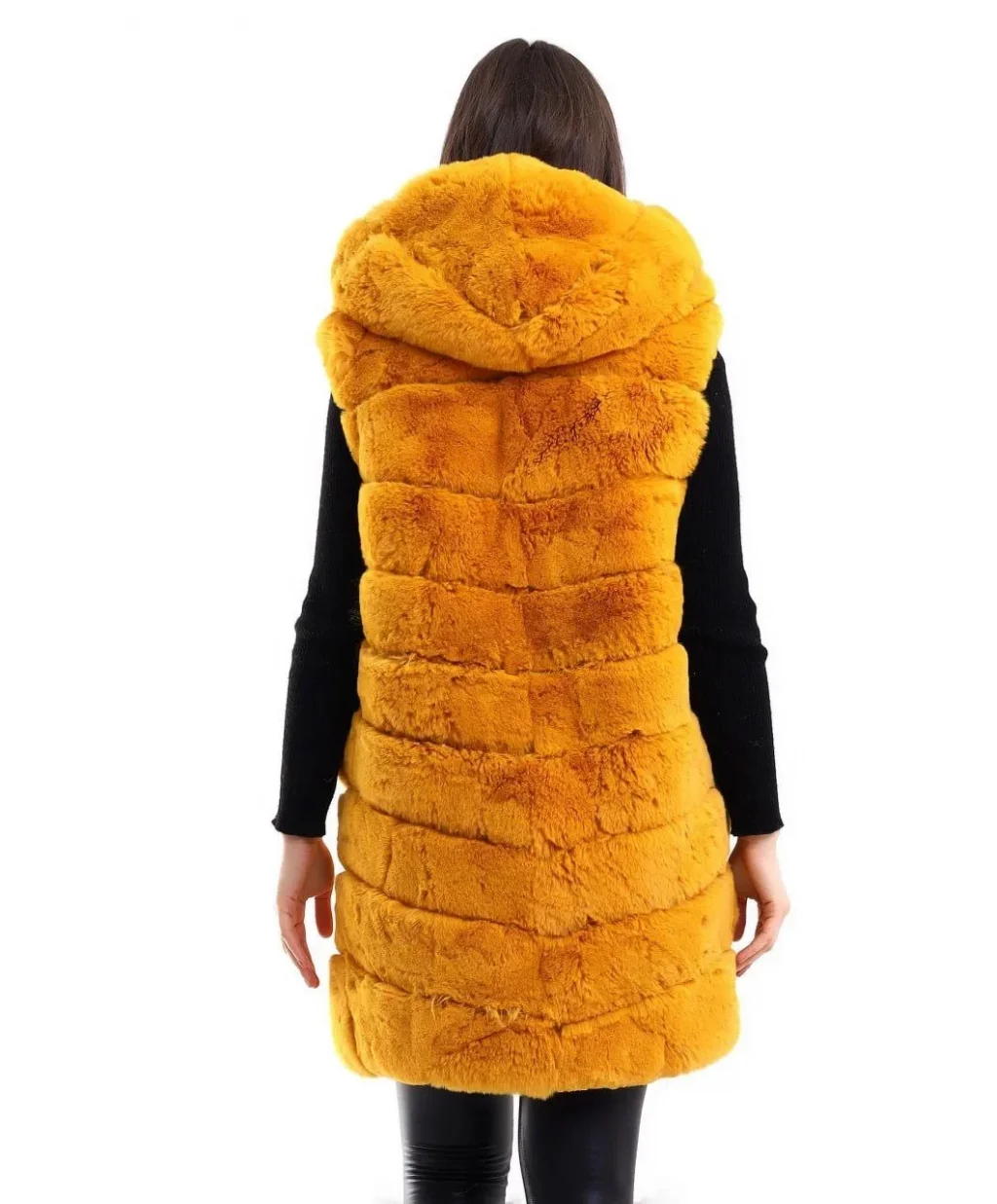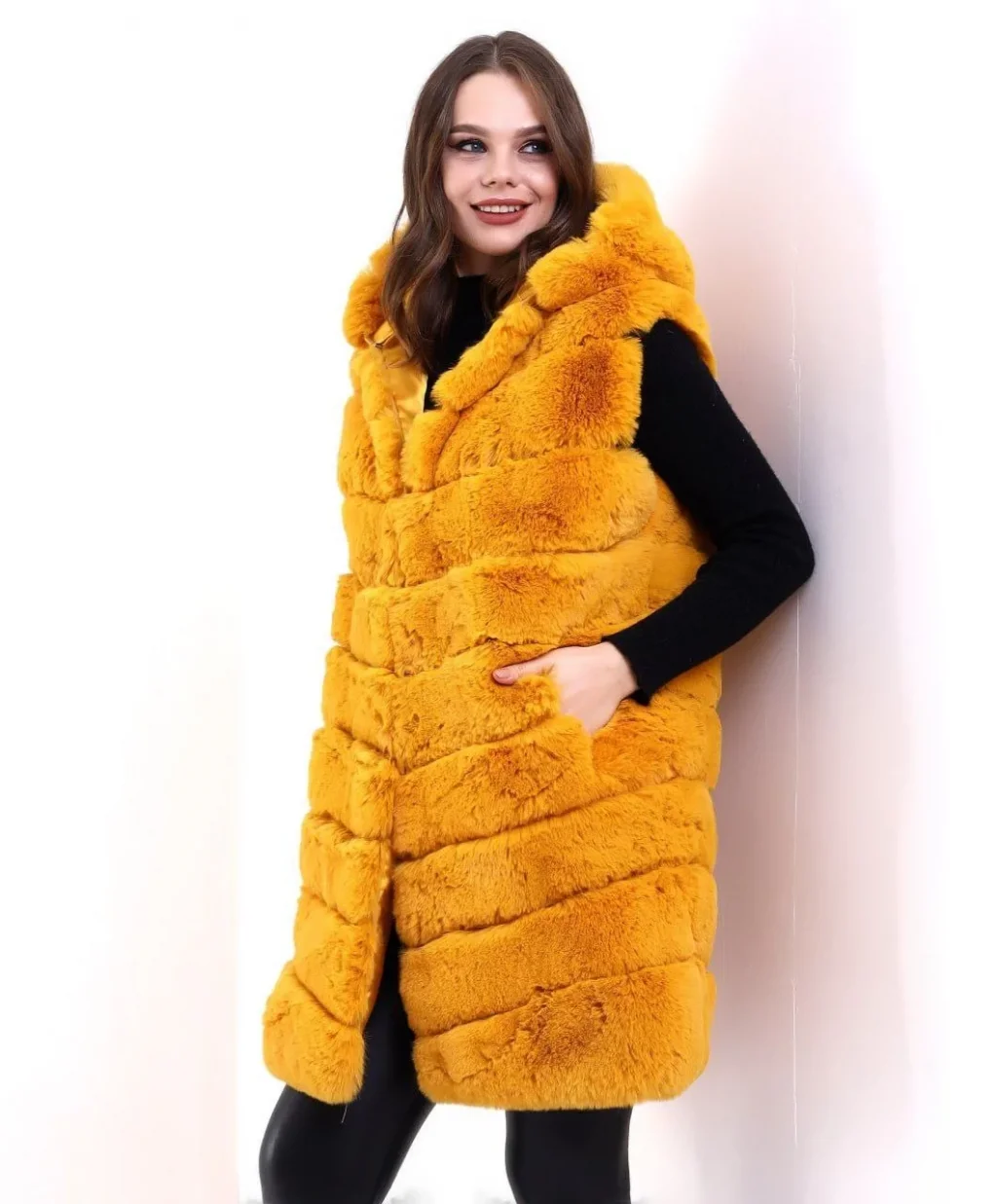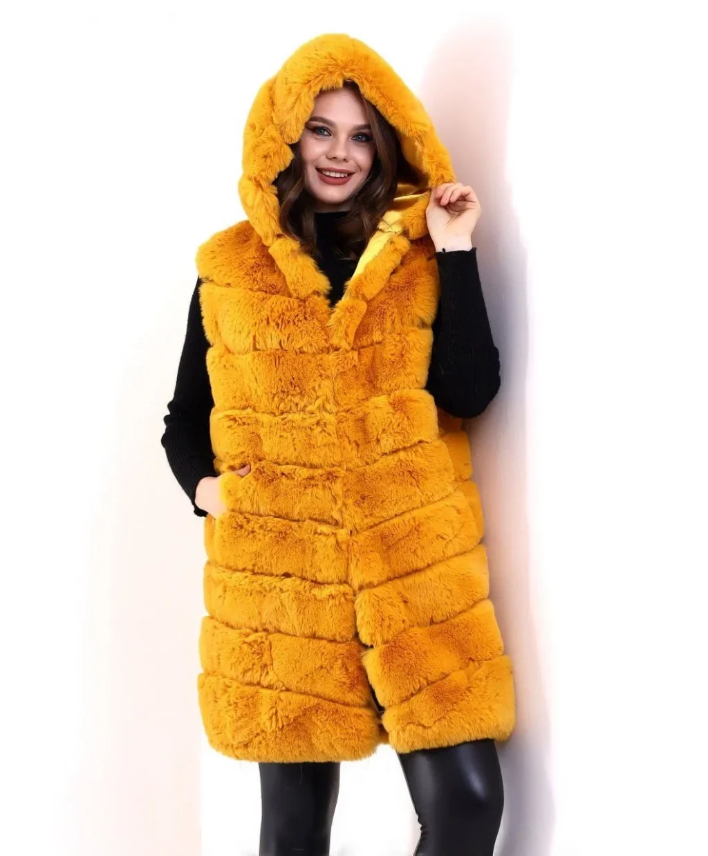 Kadın Kapşonlu Peluş Kürk Yelek Premium Kalite, Tam Astarlı, Uzun Model - Sarı