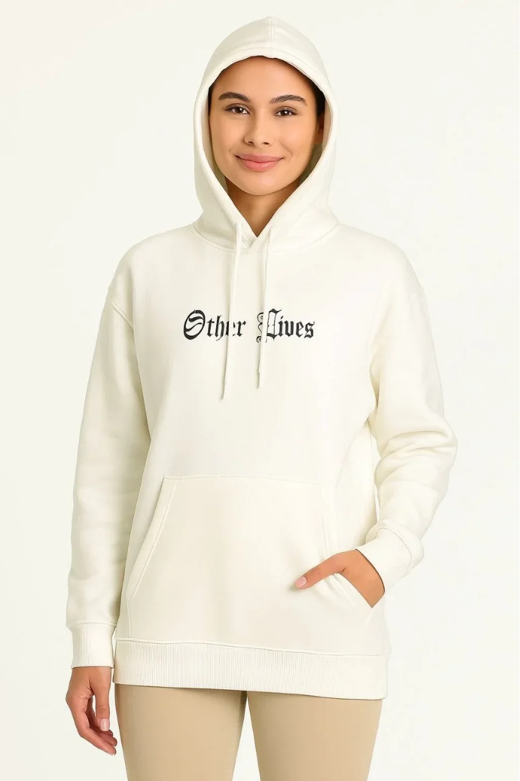 Kadın Kapşonlu Sweatshirt – Oversize Üç İplik Şardonlu Hoodie, “Other Lives” Ön & Arka Baskılı, Kanguru Cepli, Kışlık Rahat Günlük Stil - Beyaz