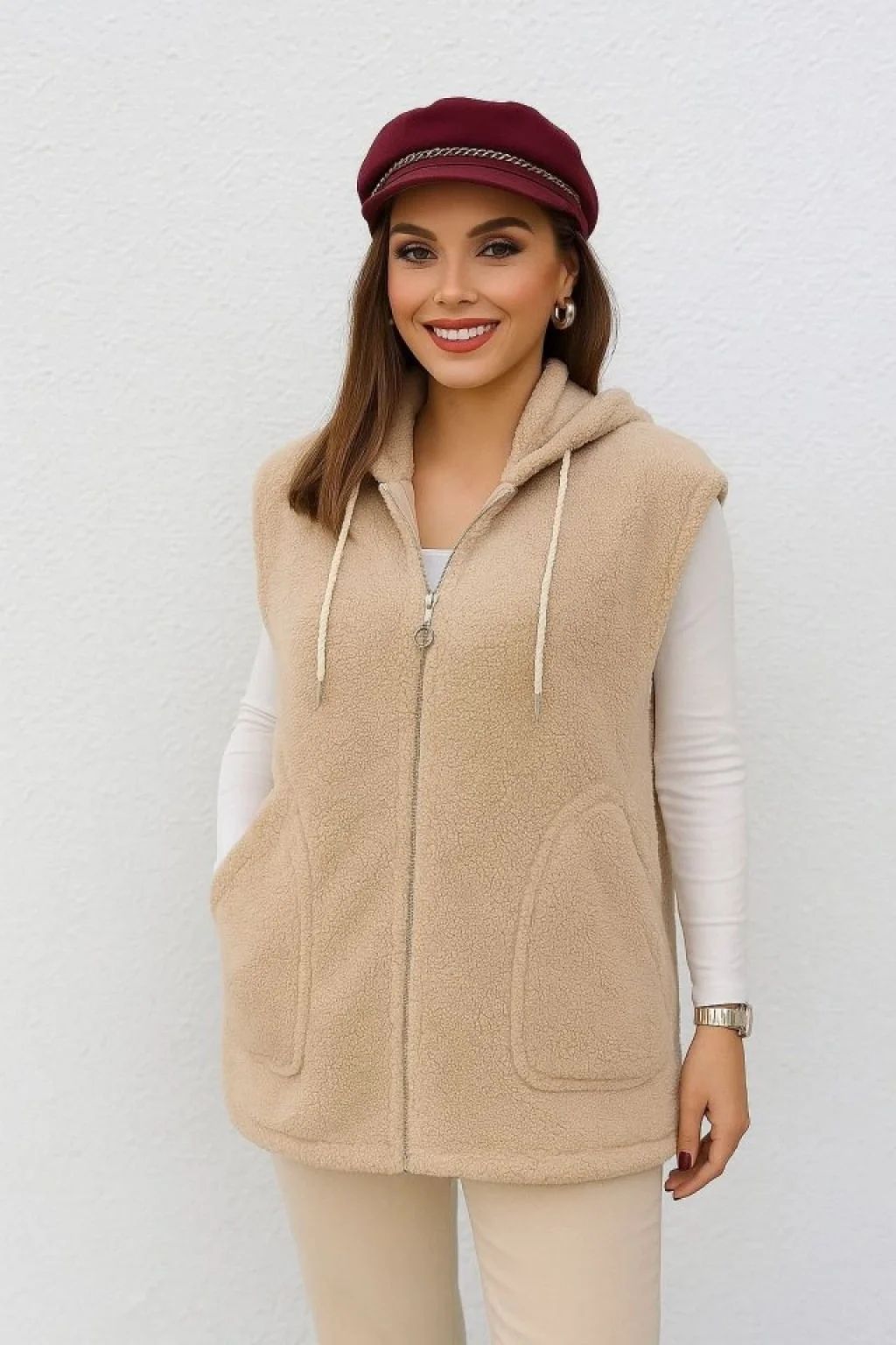 Kadın Kapüşon Ve Fermuar Detay Welsoft Kolsuz Yelek
